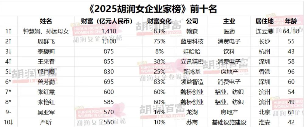 10月30日,胡润研究院发布《2025胡润女企业家榜》,列出了今年胡润百富榜中的前50名女企业家。 来自中国创新药头部企业翰森的钟慧娟、孙远母女,以1410亿元财富首次成为中国女首富;蓝思科技周群飞财富增长470亿元,以1100亿元位 列第二;宗馥莉以875亿元排名第三,较去年下降两位。 | | | | 《2025胡润女企业家榜》 前十名 | | | | | | --- | --- | --- | --- | --- | --- | --- | --- | | | 姓名 | 财富(亿元人民币) | 财富变化 = | 公司 | 主业 | 居住地 年龄 | | | 11 | 钟慧娟、孙远母女 | Driver Non 1.410 | 83% | 朝来 | 医药 | 连云港 | 64. 38 | | 21 | 周群飞 | 湖润又止1,100 | 75% | 脂思科技 | 消费电子 | 长沙 | રેર | | 31 | 宗頓莉 | 875 | 8% | 娃哈哈 | 饮料 | 杭州 | 43 | | 41 | 王来春 | 822 | 38% | 立讯精密 | 消费电子 | 深圳 | 58 | | | 51 - B = ...