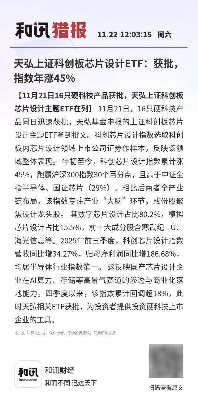 【11月21日16只硬科技产品获批,天弘上证科创板芯片设计主题ETF在列】11月21日,16只硬科技产品 同日迅速获批,天弘基金申报的上证科创板芯片设计主题ETF拿到批文。科创芯片设计指数选取科创板 内芯片设计领域上市公司证券作样本,反映该领域整体表现。 年初至今,科创芯片设计指数累计涨 45%,跑赢沪深300指数30个百分点,且高于中证全指半导体、国证芯片(29%)。相比后两者全产业 链布局,该指数专注产业"大脑"环节,成份股聚焦设计龙头股。 其数字芯片设计占比80.2%,模拟芯片 设计占比15.5%,前十大成分股含寒武纪 - U、海光信息等。2025年前三季度,科创芯片设计指数营收 同比增34.27%,归母净利润同比增186.68%,均居半导体行业指数第一。 这反映国产芯片设计企业在AI 算力、存储等高景气赛道的渗透与商业化落地能力。四季度以来,该指数累计回调超18%,此时天弘相 关ETF获批,为投资者提供投资硬科技上市企业的工具。 本文由 AI 算法生成,仅作参考,不涉投资建议,使用风险自担 本文由 Al 算法生成,仅作参考,不涉投资建议,使用风险自担 和讯财经 和而不同 迅达天下 扫码查看原文 宫收同 ...