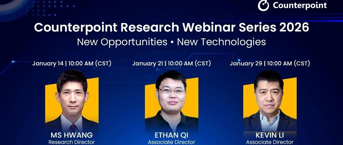 Counterpoint 咨询 . Counterpoint Research 是一家专注于科技行业的全球性研究公司,在全球主要的市场有着强大的影响 力。我们致力于为合作伙伴提供准确、及时的市场数据,帮助他们做出明智的决策。 编者荐语: Counterpoint 首次公开研讨会,点击文末阅读原文链接即可免费注册。席位有限,先定先得 以下文章来源于Counterpoint 咨询 ,作者Counterpoint Counterpoint Research将于2026年1月举办三场系列公开网络研讨会,分别聚焦内存价格走势、人形 机器人及汽车市场动态,助力企业预判行业变革并把握新兴机遇。 研讨会日程及演讲嘉宾 2026年1月14日(周三) | 上午10:00(北京时间) | 英文场次 新际遇|存储价格变化:市场怎么看?企业如何应对? 演讲嘉宾: Counterpoint 研究总监 MS Hwang 2026年1月21日(周三)| 上午10:00(北京时间)| 中文场次 新技术|人型机器人新定义:未来角色与供应链动态 演讲嘉宾: Counterpoint 副总监 Ethan Qi 2026年1月22日(周四)| 上午1 ...