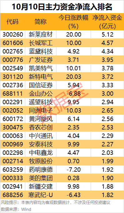 医药生物行业获主力资金净流入居首。 据证券时报·数据宝统计,今日(10月10日)沪深两市主力资金净流出929.6亿元,其中创业板净流出 415.71亿元,沪深300成份股净流出396亿元。 行业板块方面,申万一级18个行业上涨,建筑材料行业涨幅居首,达1.92%;煤炭、纺织服饰、石油石 化和美容护理行业涨幅均在1%以上。13个下跌行业中,电子和电力设备均跌超4%,计算机跌3.7%,有 色金属、传媒和通信行业均跌超2%。 从资金流向来看,申万一级行业中,6个行业获主力资金净流入。医药生物行业净流入金额居首,达5.2 亿元;农林牧渔、纺织服饰和美容护理行业净流入均在1.4亿元以上。 25个主力资金净流出的行业中,电子和电力设备行业净流出金额居前,均超210亿元,有色金属行业主 力资金净流出104.47亿元。计算机、通信、机械设备和汽车等行业净流出均超30亿元。 光刻机概念股获主力资金抢筹居首 从个股来看,60股主力资金净流入均超1亿元,其中15股净流入均超2亿元。 光刻机概念股新莱应材"20cm"涨停,主力资金净流入5.12亿元,居首。龙虎榜数据显示,上榜营业部席 位全天成交8.34亿元,占当日总成交金额比例为2 ...