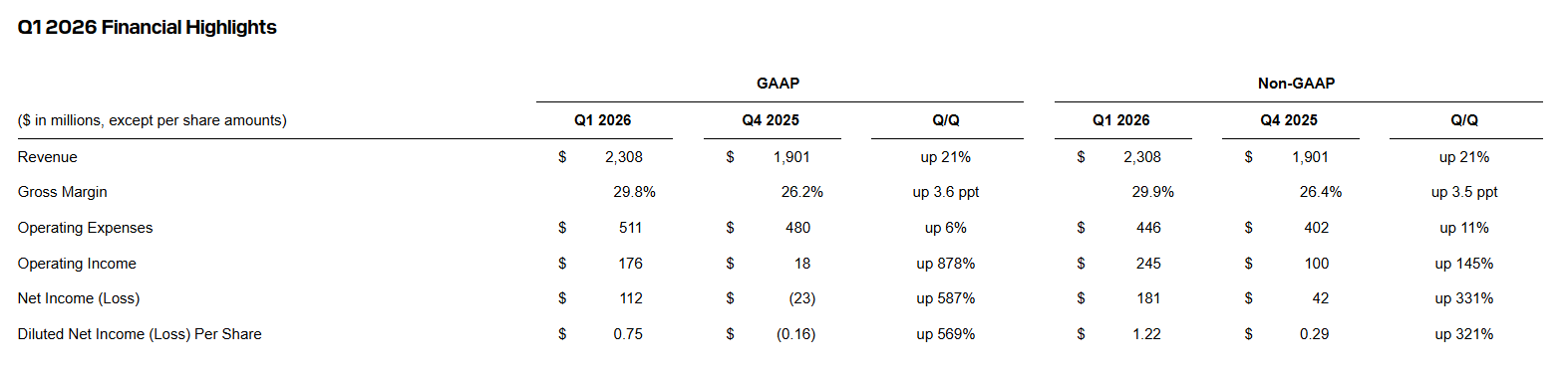 Core Viewpoint - SanDisk (SNDK.US) reported Q1 FY2026 earnings that significantly exceeded Wall Street analysts' expectations, highlighting the ongoing demand surge for storage products driven by AI training and inference needs [1][3][5] Financial Performance - SanDisk's Q1 revenue reached $2.308 billion, a 23% year-over-year increase and a 21% quarter-over-quarter increase, surpassing the expected $2.1 billion [3][4] - The company's Non-GAAP adjusted earnings per share were $1.22, well above the previous quarter's $0.29 and the analysts' forecast of $0.89 [3] - Operating income surged to $176 million, reflecting an 878% quarter-over-quarter increase, while net income was approximately $112 million, a significant recovery from a loss of $23 million in the previous quarter [4][3] - Gross margin improved to 29.8%, up from 26.2% in the previous quarter [4] Market Position and Outlook - SanDisk, as a standalone entity since its split from Western Digital in 2025, has seen its stock price increase nearly 500% due to the unprecedented demand for storage driven by AI [2][5] - The company expects Q2 FY2026 revenue to be between $2.55 billion and $2.65 billion, exceeding the analysts' average estimate of $2.36 billion [5] - Analysts are optimistic about the storage sector, with Morgan Stanley and Bank of America raising their target prices for SanDisk significantly, indicating strong bullish sentiment [5] Industry Trends - The demand for enterprise SSDs is expected to grow significantly, with projections indicating a CAGR of over 35% from 2024 to 2030, particularly driven by AI inference and training workloads [7][10] - The AI infrastructure investment cycle is creating a "storage supercycle," benefiting major storage companies like SanDisk, Seagate, and Western Digital [10][11] - The integration of high-capacity enterprise SSDs in AI data centers is becoming critical, as they provide the necessary balance of throughput, latency, and energy efficiency for AI workloads [6][7]