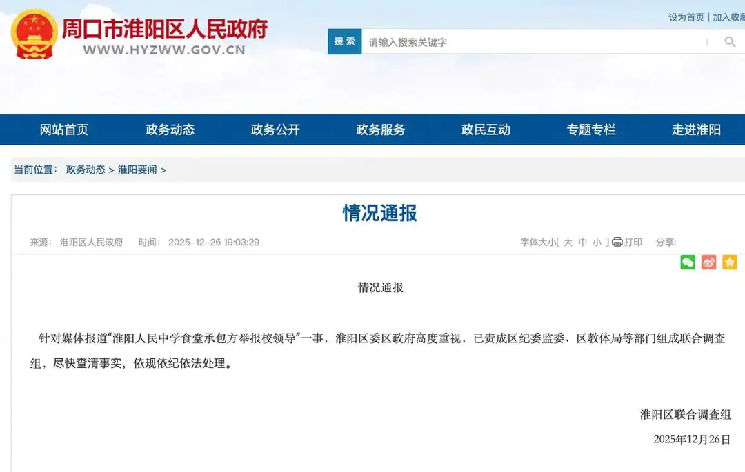 齐鲁晚报.齐鲁壹点编辑袁野 河南周口淮阳区联合调查组12月26日发布情况通报:针对媒体报道"淮阳人民中学食堂承包方举报校领导"一事,淮阳区委区政府高度重视,已责成区纪委 监委、区教体局等部门组成联合调查组,尽快查清事实,依规依纪依法处理。 | 周■同程H区人民政府 | | | | | | 设为首页 加入收藏 | | --- | --- | --- | --- | --- | --- | --- | | WWW.HYZWW.GOV.CN | | 搜索 请输入搜索关键字 | | - | | ರ | | 网站首页 | 政务公开 政务动态 | | 政务服务 | 政民互动 | 专题专栏 | 走进准阳 | | 当前位置:政务动态 > 淮阳要闻 > | | | | | | | | | | | 情况通报 | | | | | 来源:淮阳区人民政府 | 时间:2025-12-26 19:03:29 | | | | 字体大小[大中 小 ] ◎打印 | 分享: | | | | | | | | 6 6 女 | | | | | 情况通报 | | | | | 针对媒体报道"淮阳人民中学食堂承包方举报校领导"一事,淮阳区委区政府高度重视. ...