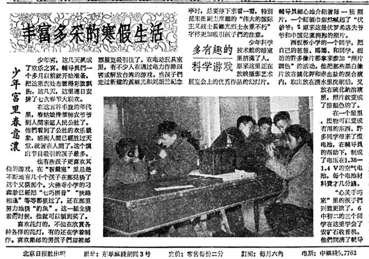 1959年2月11日,《北京晚报》4版。 1960年寒假,麻线胡同小学的一个活动小组。 罗郁文 摄 盼望着、盼望着,寒假就要来了。您知道吗?上世纪五六十年代,不少学校只放10天假,正月初九就开 学。相比之下,现在的寒假是那时候的四倍长。几十年间,物阜民丰,寒假的过法也越来越丰富,参加 冬令营、出国出境游、担当志愿者……"神兽出笼",多姿多彩。 练舞蹈。李士炘 摄 1983年2月19日,《北京晚报》2版。 1965年寒假,孩子们在西城区少年之家排 报》。 本报记者 翟伟 摄 1998年2月1日,《北京晚报》1版。 1999 年寒假,53名灾区孩子受邀来京过年。 在没有手机的年代,信件显得尤为重要,北京有不少因地址不详无法投递的"瞎信"。据市邮电局反映, 1985年每天无法投递的平信超过二十万件。(1985年8月14日《北京晚报》1版《本市每日20万件地址不 您可能想不到,上世纪五六十年代,中小学的寒假比现在要短得多。1959年,部分学校的寒假只有10天 至半个月。(1959年1月26日《北京晚报》4版《本市小学校今起陆续放寒假》) 当时作业不多,突击一下两天就能全做完。孩子们凭一条红领巾就可以去街道的少年之家或 ...
