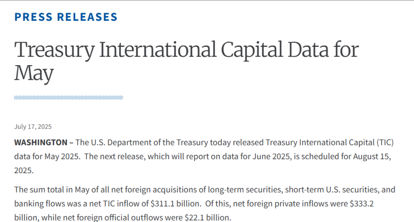美财政部公布5月国际资本流动报告。 当地时间7月17日,美国财政部官网发布5月国际资本流动报告(Treasury International Capital Data for May)(下称TIC 报告)显示,截至今年5月,外国投资者持有美国国债总额达到9.0458万亿美元,为历史第二高水平,仅次于今年3 月。 今年5月,外国投资者在美净增持证券资产3111亿美元。其中,外国投资者从4月净减持506亿美元美国长期证券转为5 月净增持3185亿美元。 截至今年5月,美国国债前三大海外债主分别是日本、英国和中国(大陆地区)。其中,中国当月持有美国国债规模7563 亿美元,较上月减持9亿美元,为连续第三个月减持美国国债。此外,加拿大在当月大幅增持美国国债617亿美元。 5月海外大幅增持美国长期证券 TIC报告长期以来是全球投资者和政策制定者跟踪海外投资者持有美债变化的重要参考。最新数据显示,今年5月,海 外净增持美国长期、短期证券和银行现金流(banking flows),即外国投资者在美净增持证券资产为3111亿美元。其 中,私人外资净增持3332亿美元,官方外资净减持221亿美元。 在持有美国长期证券方面,5月 ...