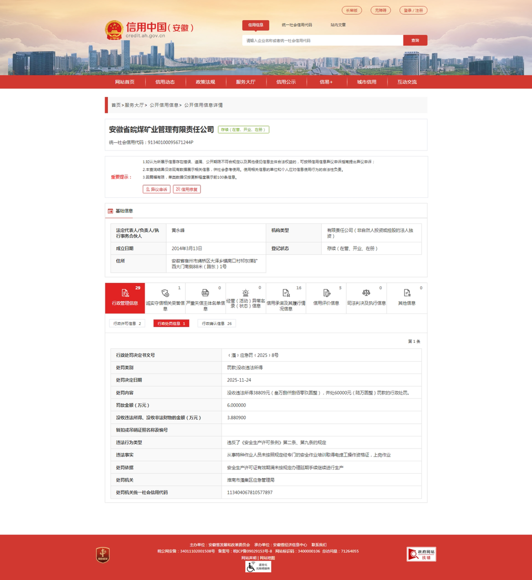 齐鲁晚报·齐鲁壹点记者于信用中国(安徽)公开信用信息栏获悉,11月24日,皖北煤电旗下的安徽省皖煤矿业管理有限责任公司(下称"皖煤矿业管理公 司")收到罚单,处罚类别是"罚款;没收违法所得",处罚机关为淮南市潘集区应急管理局。 | | 长期版 无障碍 登录 / 注册 | | --- | --- | | 信用信息 | 规一社会僵用代码 站内文堂 | | | 请输入企业名称或者说一社会信用代码 查询 | | 网站首页 信用动态 政策法规 | 服务大厅 信用公示 信易+ 城市信用 互动交流 | | 首页>服务大厅> 公开信用信息> 公开信用信息详情 | | | 安徽省皖煤矿业管理有限责任公司 | 存续(在营、开业、在册 ) | | 统一社会信用代码:91340100095671244P | | | 1,如认为所属示道恩存在错误、途漏、公开刷眼不符合规定以及其他侵犯值显主体合法权益的,可按照值用值显鼻议审诉指南提出鼻议由诉; | 2.本董演唱黑仪依观看数强暴示相关信息,供社会参考使用,使用相关信息的单位和个人应对信息使用行为的合法性负责, | | 3.因筒幅有限,單类数強仪按更新程度展示前100条值息, 重要提示: ...