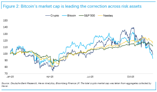 德意志银行认为比特币这轮暴跌逻辑已经发生根本性变化。 追风交易台消息,11月24日,德意志银行发表研报认为,与以往主要由散户投机驱动的崩盘不同,比特 币本轮调整下跌是由宏观经济逆风、美联储鹰派信号、监管进程停滞、机构资金外流,以及长期持有者 获利了结这"五重冲击"共同作用的结果。 数据显示,2025年迄今,比特币与纳斯达克100指数的日均相关性达到46%,与标普500指数的相关性升 至42%。 (比特币市值在各类风险资产 中率先出现下跌) (近几周来,比特币与纳斯 达克指数及标准普尔500指数的相关性有所上升) 数据显示,比特币从10月初约12.5万美元的峰值暴跌近35%至8万美元附近,导致加密市场总市值蒸发 约1万亿美元。这一轮调整不再是单一的币圈内部事件,而是比特币日益融入全球宏观金融体系后,其 作为风险资产属性的集中体现。 研报强调,比特币与科技股的相关性已大幅提高,其"数字黄金"的避险叙事在当前环境下正面临严峻考 验。这预示着比特币的投资逻辑正在发生根本性转变,风险管理的重要性被提到了前所未有的高度。 五重冲击一:比特币与科技股高度相关性 比特币此次下跌与美股等风险资产同步下滑,显示其作为防御性对冲工 ...