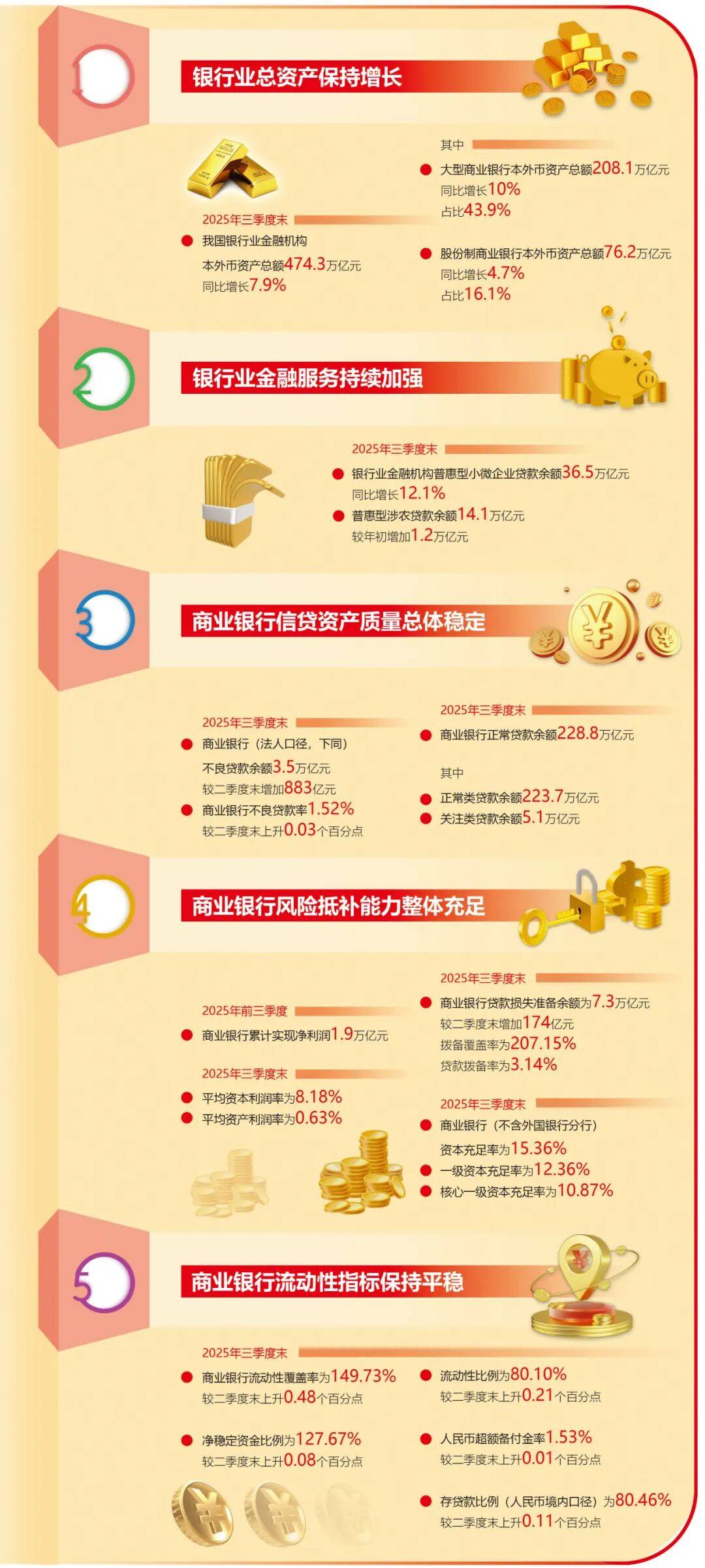 观 数 读 数 我国银行业整体运行稳健 资产结构持续优化 编者按 国家金融监督管理总局日前公布的2025年三季度银行业保险业主要监管指标数据情况显示,今年前三季度,我国银行业整体运行稳健。在行业总资产突破 474万亿元规模的同时,普惠金融贷款保持两位数增长,商业银行盈利能力保持稳定,风险抵补能力持续夯实。 更为重要的是,商业银行审慎经营的理念和充足的风险准备,为应对潜在风险提供了厚实的"安全垫"。数据显示,2025年前三季度,商业银行累计实现净 利润1.9万亿元,保持了稳健的盈利能力,平均资本利润率和资产利润率分别为8.18%和0.63%。这些利润是补充资本、增强风险抵御能力的内生源泉。截 至三季度末,商业银行的贷款损失准备余额达到7.3万亿元,拨备覆盖率为207.15%。同时,资本充足率达到15.36%,核心一级资本充足率为10.87%,均保 持在较高水平。此外,流动性覆盖率、净稳定资金比例等多项流动性指标均保持平稳且略有上升,共同构筑起一道多层次、立体化的金融安全防线。 总体来看,2025年三季度,我国银行业在规模、结构、质量和效益等多个维度上均交出了一份令人安心的答卷。有观点建议,下一步,银行业还应通过 ...