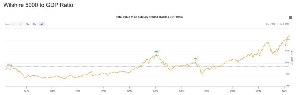 Group 1 - The Buffett Indicator has reached approximately 224%, marking a historical high, indicating that the total market capitalization of U.S. stocks exceeds twice the size of the U.S. economy [1][4] - This extreme deviation from historical norms often precedes significant market pressure and potential economic downturns [1][4] - The indicator has been rising since 2010, reflecting prolonged loose monetary policy, corporate valuation expansion, and strong investor preference for risk assets [4] Group 2 - The recent surge in the Buffett Indicator is particularly concerning as it coincides with signs of slowing growth in certain sectors of the real economy [5] - When market capitalization expands at a rate faster than GDP for an extended period, it often suggests that the implied expectations in stock prices may be overly optimistic [5]