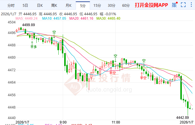 摘要今日周三(1月7日)亚市时段,黄金带着多年历史性上涨动能进入2026年,虽2024-2025年屡创纪录高 位、频被指"超买",但市场持仓拥挤度仍合理——贵金属调整中,黄金回撤幅度最小。更关键的是,机 构持仓还有显著扩张空间,本轮涨势并非短期投机推动,而是依托未到顶的结构性需求,可持续性更 强。 今日周三(1月7日)亚市时段,黄金带着多年历史性上涨动能进入2026年,虽2024-2025年屡创纪录高位、 频被指"超买",但市场持仓拥挤度仍合理——贵金属调整中,黄金回撤幅度最小。更关键的是,机构持 仓还有显著扩张空间,本轮涨势并非短期投机推动,而是依托未到顶的结构性需求,可持续性更强。 黄金价格月线维持多头通道,但RSI处历史高位,乖离需以时间修正;周线围绕10周均线4230震荡, MACD高位死叉,倾向区间运行;日线关键在4318中轨与4520上轨间抉择,4小时布林收口,4380为上 沿、4300为下沿,等待放量突破。 【基本面解析】 关注上方阻力:4516-4544历史压力带;下方支撑:4230-4274、4115,极限4000。策略:区间内高抛低 吸,突破4400跟多、目标4516-4544;跌破423 ...