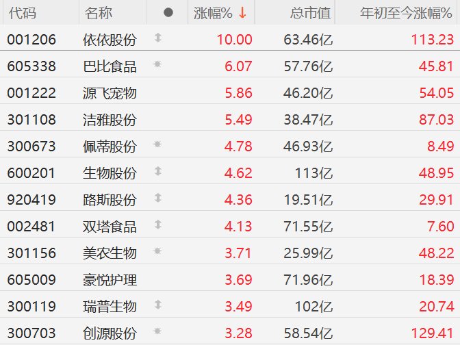 | 代码 | 名称 | | 涨幅% ↓ | 总市值 | 年初至今涨幅%。 | | --- | --- | --- | --- | --- | --- | | 001206 | 依依股份 | 1 | 10.00 | 63.46亿 | 113.23 | | 605338 | 巴比食品 | 策 | 6.07 | 57.76亿 | 45.81 | | 001222 | 源で宠物 | | 5.86 | 46.20亿 | 54.05 | | 301108 | 洁雅股份 | | 5.49 | 38.47亿 | 87.03 | | 300673 | 佩蒂股份 | 美 | 4.78 | 46.93亿 | 8.49 | | 600201 | 生物股份 | 4 | 4.62 | 113亿 | 48.95 | | 920419 | 路斯股份 | A | 4.36 | 19.51亿 | 29.91 | | 002481 | 双塔食品 | 1 | 4.13 | 71.55亿 | 7.60 | | 301156 | 美农生物 | 家 | 3.71 | 25.99亿 | 48.22 | | 605009 | 豪悦护理 | | 3.69 | ...