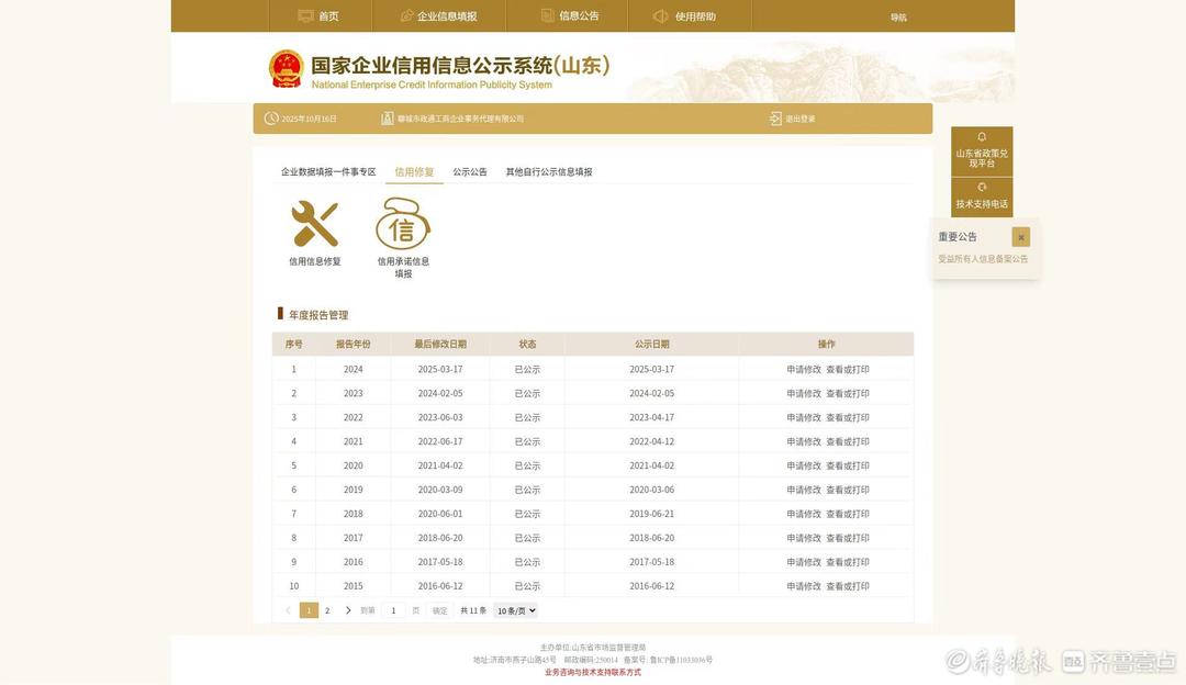 聊城市市场监管局在企业发展的波动期与调整期,聚焦"防风险"与"善始终",创新推行以"三书同达""信用修复""罚后回访"为核心的审慎监管模式,让执 法既有力度又不失温度。 升级"三书同达",实现执法与指导同步。将原有的"两书同达"升级为"三书同达",即在送达《行政处罚决定书》时,同步送达《行政合规建议书》和《信 用修复告知书》。这一举措变"一罚了之"为"惩教结合",在依法处罚的同时,主动告知企业"如何避免失信"和"如何修复信用",引导市场主体主动纠错、 合规经营。截至目前,已累计制发合规建议书800余份,从源头预防和减少违法违规行为。 | ■ 首页 | | 企业信息填报 | ■ 信息公告 | (1) 使用帮助 | 明格 | | | --- | --- | --- | --- | --- | --- | --- | | | | THERER 200 200 11 | | | | | | | | Enterprise Credit Information Publicity System | | | | | | ( 2025年10月10日 | | 【 # # 2003 | | | 因 明出型家 | | | | | ...