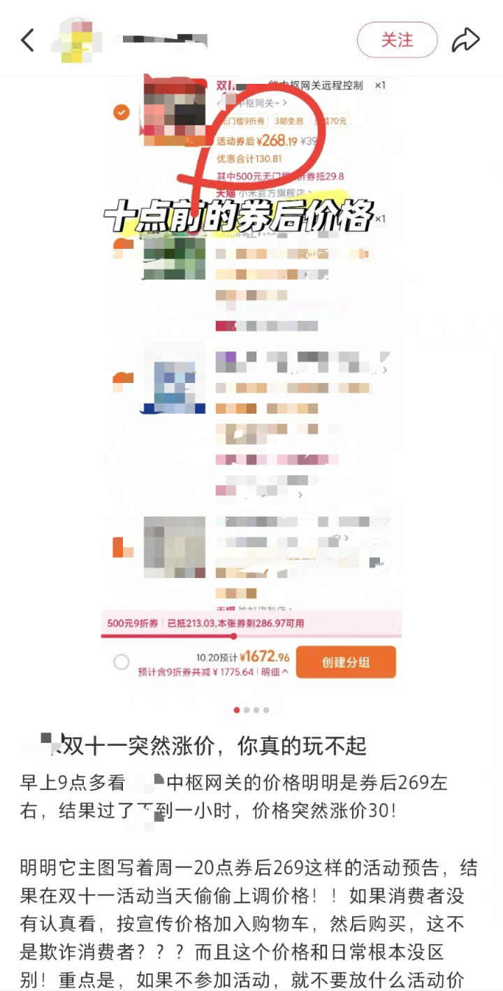 记者丨吴立洋,实习生涂玥 编辑丨高梦阳 早上9点多看 --中枢网关的价格明明是券后269左 右,结果过了下到一小时,价格突然涨价30! 明明它主图写着周一20点券后269这样的活动预告,结 果在双十一活动当天偷偷上调价格!!如果消费者没 有认真看,按宣传价格加入购物车,然后购买,这不 是欺诈消费者? ? ? 而且这个价格和日常根本没区 别! 重点是,如果不参加活动,就不要放什么活动价 手汗 是把我 10月20日晚八点,今年的"双十一"大促在多个平台正式开启,相较于2024年国补政策落地后 对家电市场的强势带动,2025年的整体热度相对平和了很多。 但与此同时, 多位消费者在社交平台表示,在双十一优惠活动开启后,自己加购在购物车中 的家电产品出现了较大价格波动,部分产品在叠加大促优惠后,价格相较于前一轮618大促有 所上涨,甚至高于双十一开启之前暑期的价格。 例如有消费者表示,此前看到的某品牌烘干机,双十一开启前标价11990元,叠加国补与平台 商家补贴后实际到手价格为7292元;但在双十一开启后,标价并未改变,但平台商家补贴金额 大幅降低,导致到手价升至8581元,价格大幅提升。 一双十一突然涨价,你真的玩不 ...