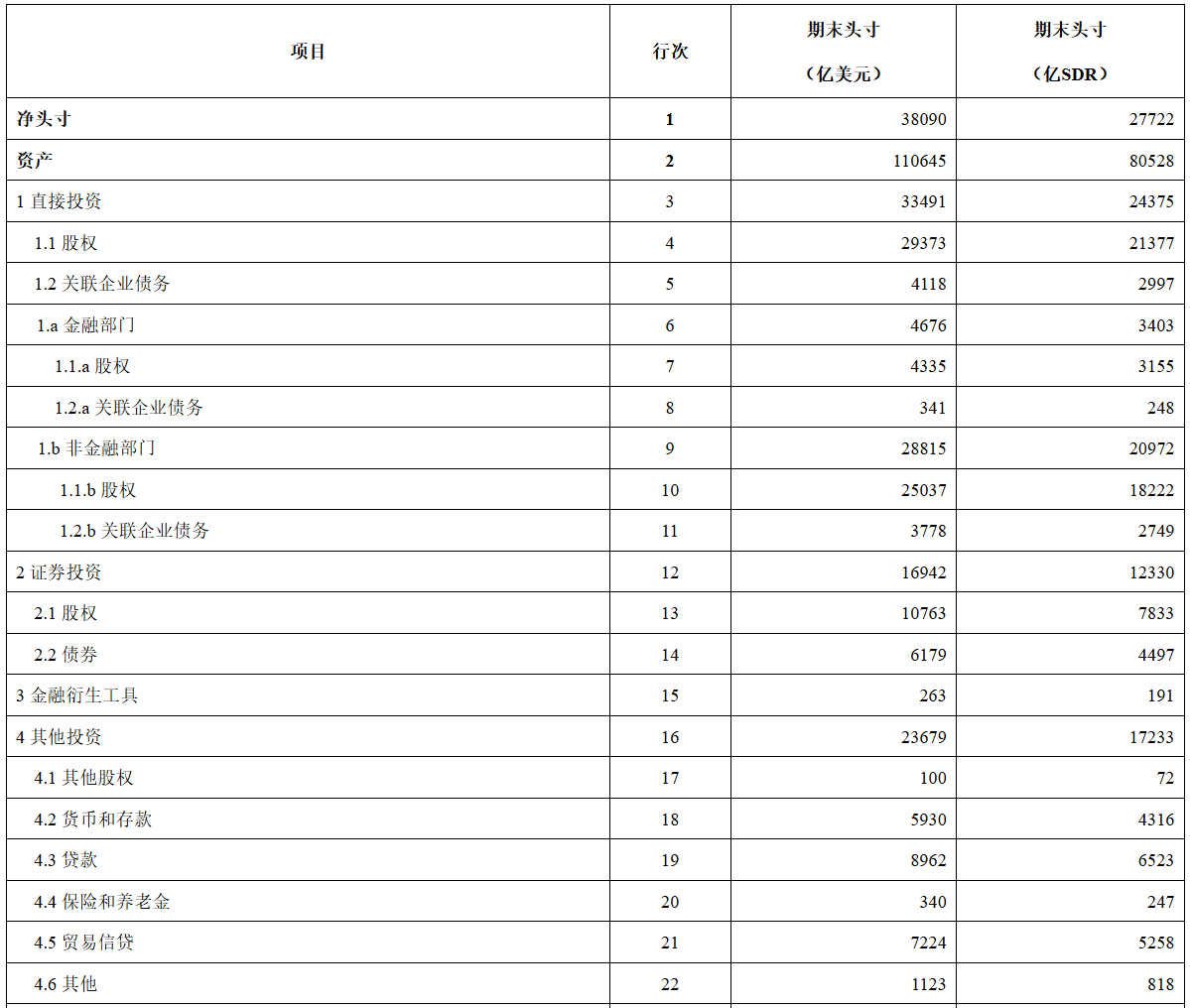 智通财经APP获悉,国家外汇管理局公布2025年6月末我国国际投资头寸表。2025年6月末,我国对外金融资产110645亿美元,对外负债72555亿美元,对外 净资产38090亿美元。 2025年6月末中国国际投资头寸表 | 5 储备资产 | 23 | 36271 | | --- | --- | --- | | 5.1 货币黄金 | 24 | 2429 | | 5.2 特别提款权 | 25 | રરત | | 5.3 在国际货币基金组织的储备头寸 | 26 | 113 | | 5.4 外汇储备 | 27 | 33174 | | 5.5 其他储备资产 | 28 | -ર | | 负债 | 29 | 72555 | | 1 直接投资 | 30 | 37174 | | 1.1 股权 | 31 | 34558 | | 1.2 关联企业债务 | 32 | 2616 | | 1.a 金融部门 | 33 | 2155 | | 1.1.a 股权 | 34 | 1983 | | 1.2.a 关联企业债务 | 3 ર | 172 | | 1.b 非金融部门 | 36 | 35019 | | 1.1.b 股权 | 37 | 325 ...