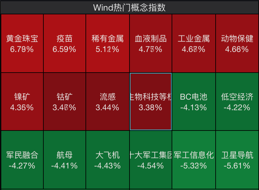 印度出现尼帕病毒疫情。 A股市场方面,今日午后,疫苗、流感、生物科技的概念股大幅拉升,迈克生物、凯普生物、之江生物、金迪克、华 兰疫苗等20%涨停。 | | | | Wind热门概念指数 | | | | --- | --- | --- | --- | --- | --- | | 黄金珠宝 | 疫苗 | 稀有金属 | 血液制品 | 工业等属 | 动物保健 | | 6.78% | 6.59% | 5.12% | 4.75% | 4.68% | 4.68% | | ゙゙゙ ゙ ゙ ゙ ゙ ゙ ゙ ゙ ゙ ゙ ゙ ゙ ゙ ゙ ゙ ゙ ゙ ゙ ゙ ‐ | 钻矿 | 流感 | E物科技等材 | BC电池 | 低空经济 | | 4.36% | 3.46% | 3.44% | 3.38% | -4.13% | -4.22% | | 军民融合 | 航母 | 大飞机 | 十大军工集团军工信息化 | | 卫星导航 | | -4.27% | -4.41% | -4.43% | -4.54% | -5.32% | -5.61% | 同时,记者在深交所互动易、上证e互动等平台上看到,多位投资者在询问上市公司是否有尼帕病毒相关产品。 据世 ...