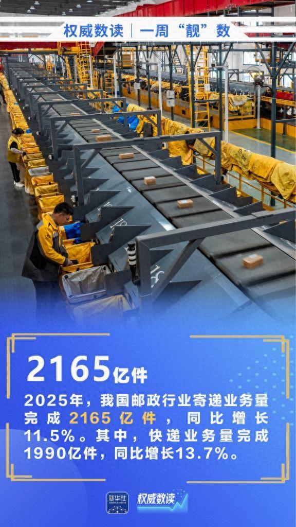 转自:北京日报客户端 2025年12月份,全国居民消费价格指数(CPI)环比上涨0.2%,同比上涨0.8%;2024年至2025年以旧换 新政策带动消费品销售额3.92万亿元,惠及消费者4.94亿人次;2025年我国邮政行业寄递业务量完成 2165亿件,同比增长11.5%……本周,这些数据最值得关注! 2165z4 2025年,我国邮政行业寄递业务量 完 成 2165 亿 件 , 同 比 增 长 11.5%。其中,快递业务量完成 1990亿件,同比增长13.7%。 权威数读 一周"靓" 权威数读 / 新华社 alther 4 120 权威数读│一周"靓"数 45.88亿人次 2025年,全国铁路完成旅客发送量 45.88亿人次,同比增长6.4%; 完成货物发送量52.73亿吨,同比 增长2.0%。 权威数读 / 新华社 ATT 权威数读│一周"靓"数 8-321x 9 5 亿 截至2025年,我国航空总人口超5 亿,我国成为全球第一航空人口大 国。 权威数读 / 制华社 AD in " 到1.6% 1.5% 4.94亿人次 2024年至2025年,我国实现汽车 以旧换新1830万辆,其中新能源汽 车占比近60 ...