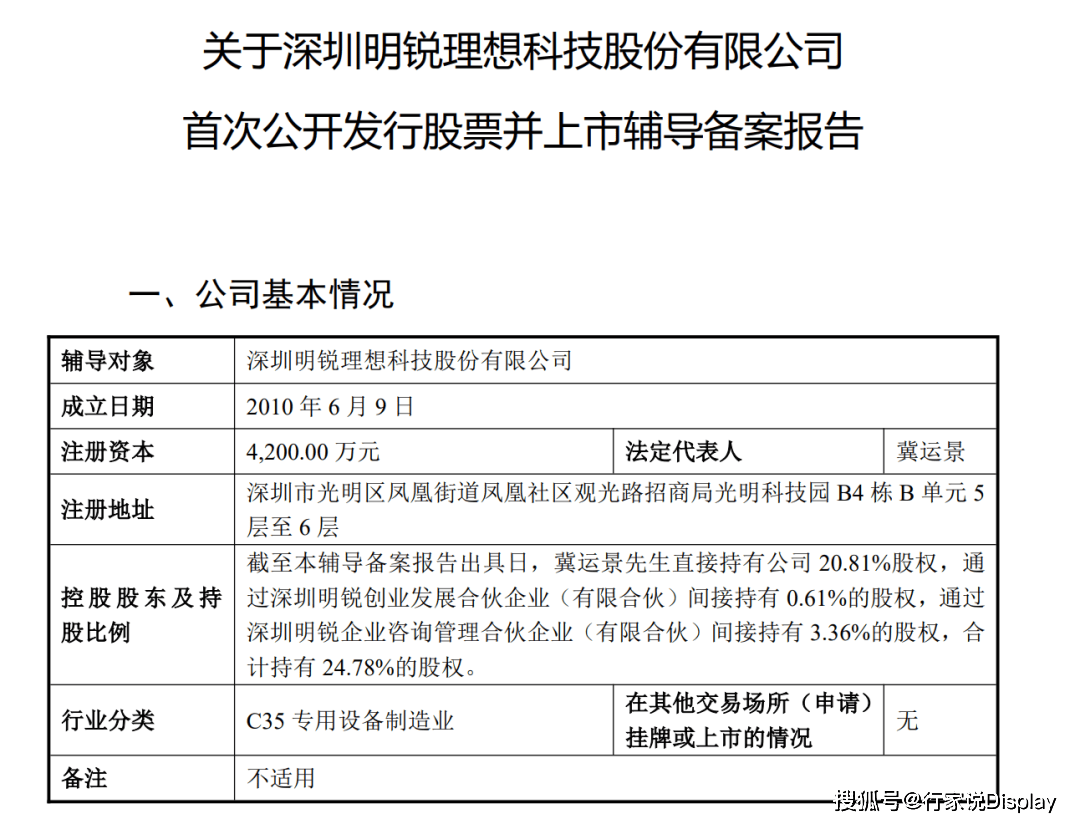 11月25日,证监会官网显示,深圳明锐理想科技股份有限公司(简称"明锐理想")在深圳证监局上市辅导备案,辅导机构为国泰海通。 股权结构上,辅导文件显示,截至本辅导备案报告出具日,冀运景直接持有明锐理想20.81%股权,通过深圳明锐创业发展合伙企业(有限合伙)间接持 有0.61%的股权,通过深圳明锐企业咨询管理合伙企业(有限合伙)间接持有3.36%的股权,合计持有24.78%的股权。 据行家说Display了解,明锐理想专注于工业视觉检测设备研发与生产,已推出电子制造领域 PCBA 板级组装、半导体芯片级封装环节的自动光学检查机 (AOI)、锡膏检查机(SPI)及 X 射线检查机(AXI)等核心产品。 其设备已广泛应用于计算机、通讯设备、汽车电子、智能手机、家用电器、半导体及 Mini LED 封装等多个领域,既满足消费电子产业链精密制造检测需 求,也覆盖半导体封装高端检测场景,形成适配智能制造与工业 4.0 发展趋势的多元化市场布局,产品亦适配新能源汽车电子部件、Mini LED 封装检测 等新兴赛道需求。 此次启动上市辅导,标志着明锐理想正式启动资本化进程。根据辅导规划,公司将借助资本市场融资渠道,进一步加 ...