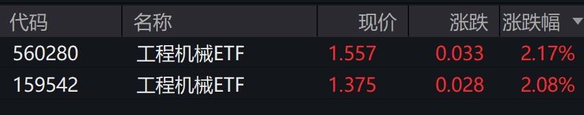受盘面影响,跟踪中证工程机械主题指数的工程机械ETF涨超2%。 | 代码 | 名称 | 现价 | 涨跌 涨跌幅 | | | --- | --- | --- | --- | --- | | 560280 | 工程机械ETF | 1.557 | 0.033 | 2.17% | | 159542 | 工程机械ETF | 1.375 | 0.028 | 2.08% | 中证工程机械主题指数选取50只业务涉及工程机械整机制造、零配件制造等工程机械领域的代表性上市公司证券作为指 数样本,以反映工程机械主题上市公司证券的整体表现。 每经记者:叶峰 每经编辑:肖芮冬 工程机械概念股早盘走强,三一重工涨超3%,徐工机械、恒立液压、中联重科涨超2%。 每日经济新闻 根据中国工程机械工业协会数据,今年1至8月我国工程机械进出口贸易额为403.98亿美元,同比增长11%。其中出口金额 385.97亿美元,同比增长11.4%;进口金额18亿美元,同比增长2.84%。有券商表示,出口金额远超进口金额,看好后续 工程机械行业仍将维持稳步增长态势。 ...