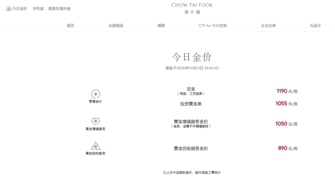 受美联储降息预期、美国加征关税等因素影响,13日伦敦现货黄金价格亚洲交易时段延续涨势,盘中一度逼近每盎司4060美元关口,达到每盎司4059.84 美元,创下历史新高。 随后,伦敦现货黄金价格持续在高位震荡。截至北京时间13日上午11时整,伦敦现货黄金价格报每盎司4047.30美元,涨幅为0.72%。 国内各品牌金饰克价上涨 记者查询国内金饰价格,周生生今日金饰价格1188元/克,昨日价格1176元/克,上涨12元/克;老庙黄金今日金饰价格1189元/克,昨日价格1183元/克,上 涨6元/克。 周大福足金金饰克价1190元,老凤祥足金金饰克价1182元。 | 名称 | 价格 (人民币/克) | | --- | --- | | 足金饰品 | 1189.00 | | 帕金饰品 | 560.00 | | 工艺金条 | 1145.00 | | | | | | 金价(人民币) | | --- | --- | --- | --- | --- | | | 足金饰品(每克 ) | 卖出 | ¥1188 | | | | | 换金价 | ¥1035 | | | | | | 换珠宝价 ¥1035 | | | く | 老凤祥今日金 ...