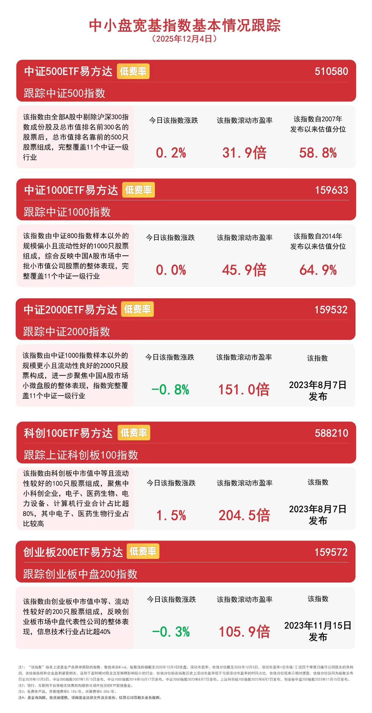 | | | 截至收盘,科创100指数上涨1.5%,中证500指数上涨0.2%,中证1000指数上涨0.01%,创业板中盘200指数下跌0.3%,中证2000指数下跌0.8%。 据瑞银中国策略师预计,A股盈利增速可能在2026年提高至8%,高于2025年的6%,即使今年股市已经上涨,估值仍具吸引力,结构性重新估值将得到无风 险利率下降、居民储蓄入市、长期资金流入以及持续推进的市值管理改革的支撑。中小盘股票在行业配置上更加均衡,科技板块占比更高,同时中证500、 中证1000等指数的隐含波动率已从10月高点回落。 | 中证500ETF易方达 低费率 | | | | | --- | --- | --- | --- | | 跟踪中证500指数 | | | | | 该指数由全部A股中剔除沪深300指 | 今日该指数涨跌 | 该指数滚动市盈率 | 该指数自 | | 数成份股及总市值排名前300名的 | | | 发布以来 | | 股票后,总市值排名靠前的500只 | | | | | 股票组成,完整覆盖11个中证一级 行业 | 0. 2% | 31.9倍 | 58. | | 该指数由创业板中市值中等、流动 | 今日该指数涨跌 ...