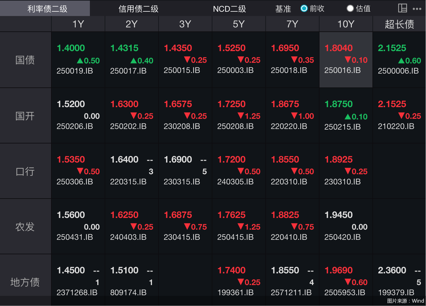 人民银行重启国债买卖后,债券市场表现平稳。Wind数据显示,11月11日开盘,债券市场各国债品种收益率全线下行,10年期国债收益率一度降至1.80%下 方。当日午后,各国债品种收益率表现不一,截至当日收盘,10年期国债收益率报1.8040%,较前一交易日下行0.1个基点。分析人士预计,市场主要受监管 政策、资金流向以及股市外溢影响等因素扰动,年内债市利率可能以区间震荡为主。 | 利率债二级 | - NCD二级 基准 ◎ 前收 | | --- | --- | | | 2Y 2 3Y 3Y 5Y 7 7 7 7 | | | 1.4000 1.8 | | 国债 | 20 0 0.50 A0.40 70.25 70.25 70.25 70.35 250 250019.IB 250017.IB 250015.IB 250003.IB 250018.IB | | | 1.5200 | | 国开 | | | | 250206.IB 250202.IB 230208.IB 250208.IB 220220.IB 250 | | | 1.5350 1.6400 -- 1.6900 -- 1.6900 -- 1.8550 1.8 ...