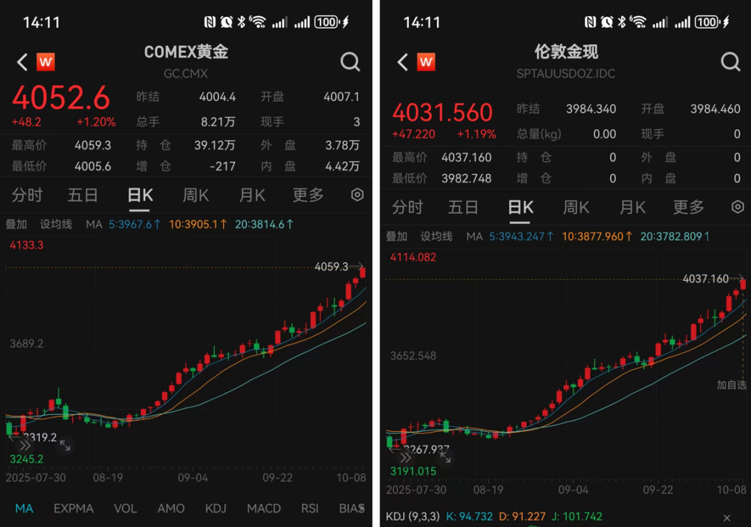 近一周金价何以"狂飙"? 刚刚过去的一周,可谓是真正的"黄金周"! 北京时间10月8日,在国庆中秋"双节"假期渐渐进入尾声之际,近期一路攀升的伦敦现货黄金价格终于在当日上午一举突破4000美元/盎司关口,为历史首 次。 而就在前一日,COMEX(纽约商品交易所)黄金期货价格更是早一步站上4000美元/盎司关口,亦刷新历史纪录。 Wind数据显示,截至北京时间10月8日14点11分,伦敦现货黄金价报4031.56美元/盎司,日涨幅超1.19%,较10月1日开盘价每盎司上涨170美元;COMEX (纽约商品交易所)黄金期货价报4052.6美元/盎司,日涨幅超1.2%,较10月1日开盘价每盎司上涨165美元。 截至目前,国际金价年内已上涨约50%。 在过去的一周,多家黄金珠宝品牌公布的境内足金首饰价格也随之上调。自10月1日至10月8日,单克足金首饰价格普遍从1130元左右攀升至1165元左右。 具体而言,10月8日,周生生足金首饰境内价格为1165元/克,单克较10月1日上涨35元;周大福足金(首饰、摆件类)、六福珠宝足金999/足金、潮宏基 足金(首饰摆件)境内价格为1162元/克,单克较10月1日前上涨33元 ...