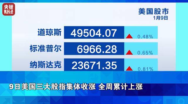 本文转自【央视财经】; 受持续的市场避险需求推动,贵金属价格全周上涨,其中纽商所黄金期货主力合约价格上涨3.96%,纽商所白银期货主力合约价格上涨11.72%。9日美国 三大股指集体收涨,全周累计上涨,欧洲三大股指集体上涨。 9日美国三大股指集体收涨 全周累计上涨 9日欧洲三大股指集体上涨 欧洲市场方面,本周五,受矿业巨头"力拓"与"嘉能可"合并谈判的消息提振,嘉能可公司股价大涨,科技股领涨助推欧洲三大股指当天全线收涨。其 中,英国富时100指数上涨0.80%,法国CAC40指数上涨1.44%,德国DAX指数涨0.53%。 9日国际油价上涨 全周布油涨超4% 当地时间本周五,美国劳工统计局公布去年最后一个月的非农就业报告,去年12月美国非农新增就业人数低于预期,但失业率回落至4.4%,就业数据好 坏参半、美股风险偏好回归,再加上多家芯片制造商股价上涨的提振,美国三大指数本周五集体收涨,其中道指涨0.48%,标普500指数涨幅0.65%,纳 指涨0.81%。从周线上看,美股芯片板块本周强势上涨,提振了市场情绪,美国三大股指集体上涨,其中道指累计涨2.32%,标普500指数上涨1.57%,纳 指上涨1.88%。 ...