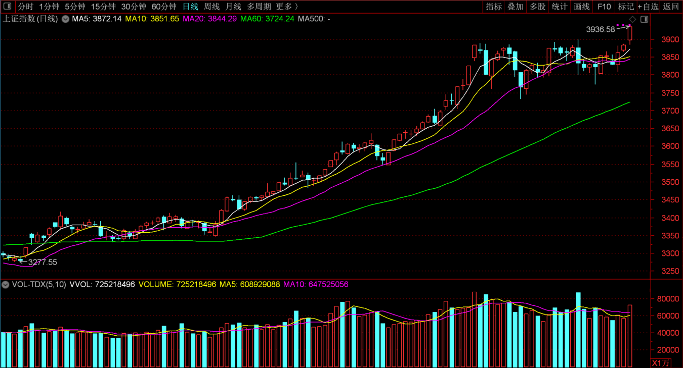 Core Viewpoint - The A-share market experienced a significant rise, with the Shanghai Composite Index reaching a ten-year high of 3936 points, indicating a breakout from a month-long consolidation phase [1][3]. Market Performance - The Shanghai Composite Index rose by over 51 points at its peak during the day, marking a notable upward trend [1]. - The ChiNext Index continued to reach new highs, reflecting strong market momentum [1]. Reasons for Market Movement - The breakthrough of the 3900-point level was anticipated before the holiday but was delayed due to selling pressure, which was alleviated post-holiday [3]. - The surge in the chip index, particularly driven by leading companies like SMIC and Cambrian, played a crucial role in lifting the market, with SMIC seeing a maximum increase of 9% and Cambrian 6% [3]. Future Market Outlook - Despite the initial strong performance, the chip index showed signs of retreat in the afternoon, with SMIC's gains reversing to a near 1% decline by the end of the day [4]. - The technology sector's decline was countered by resource stocks, particularly those represented by state-owned enterprises, which contributed positively to the index [4]. - There is an expectation of a potential style shift in the market as it enters the fourth quarter, with a focus on monitoring the pressures on the ChiNext and STAR Market [4].