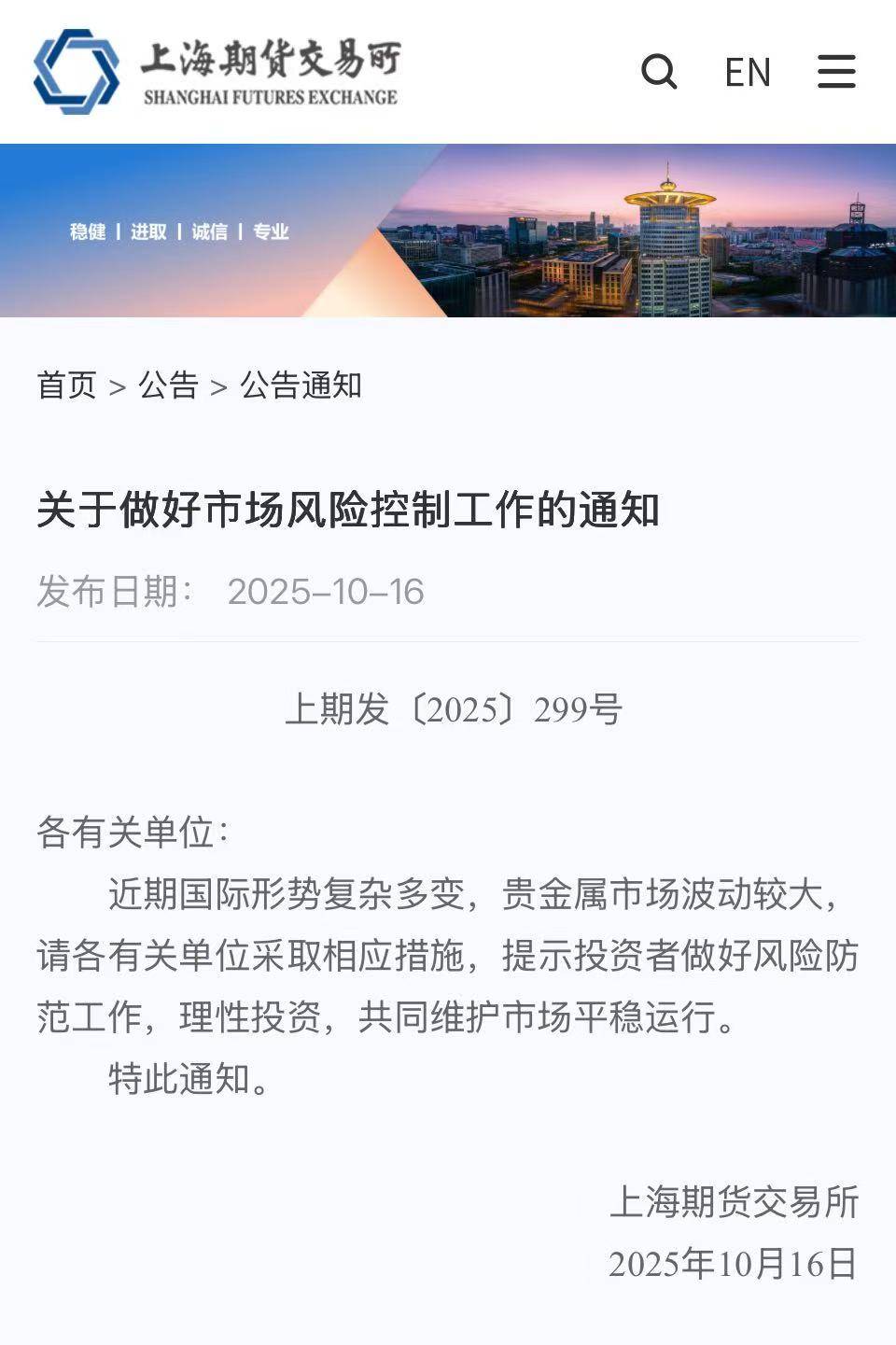 Core Viewpoint - The Shanghai Futures Exchange has issued a notice regarding market risk control, emphasizing the need for measures to manage volatility in the precious metals market due to complex international conditions [1] Group 1 - The notice highlights significant fluctuations in the precious metals market recently [1] - It calls for relevant entities to take appropriate actions to alert investors about risk prevention [1] - The exchange encourages rational investment practices to collectively maintain market stability [1]