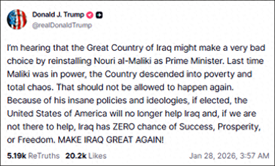 Core Viewpoint - The article discusses the U.S. government's strong opposition to the nomination of Nouri al-Maliki as Iraq's new Prime Minister, highlighting the geopolitical implications of this decision and the tensions between U.S. and Iranian influences in Iraq [1][2][4]. Group 1: U.S. Government's Position - The U.S. government expressed strong resistance to Maliki's candidacy, labeling his past governance as "extremely negative" and indicating that it would make sovereign judgments based on its interests [1][2]. - President Trump publicly warned Iraq that if Maliki were to take office, the U.S. would "no longer provide any assistance," criticizing Maliki's policies as "crazy" [2][4]. - The U.S. aims to see an Iraqi government that can "weaken Iran-supported terrorism" and dismantle militia groups, emphasizing that only such a government would be a viable partner for cooperation [1][4]. Group 2: Maliki's Background and Political Dynamics - Maliki, who has served as Prime Minister twice, has deep ties to Iranian Shiite factions and was previously pressured to resign by the U.S. [4][6]. - The nomination of Maliki has raised concerns among U.S. officials, who view him as a key representative of Iranian influence in Iraq [4][6]. - The leadership of the Shiite coalition, which nominated Maliki, includes figures associated with groups previously designated as terrorist organizations by the U.S., further complicating the political landscape [6]. Group 3: Internal Iraqi Reactions and Consequences - Maliki publicly condemned U.S. interference in Iraq's internal affairs and vowed to fight against it, despite facing significant challenges [6][7]. - The deployment of the USS Lincoln strike group to the region and potential financial measures by the U.S. could severely impact Iraq's economy, which relies on U.S. oversight of its oil revenues [6][7]. - Analysts suggest that the struggle over Maliki's nomination reflects deeper contradictions in Iraq's sovereignty and its reliance on external powers, with significant implications for the balance of power in the region [7][9].