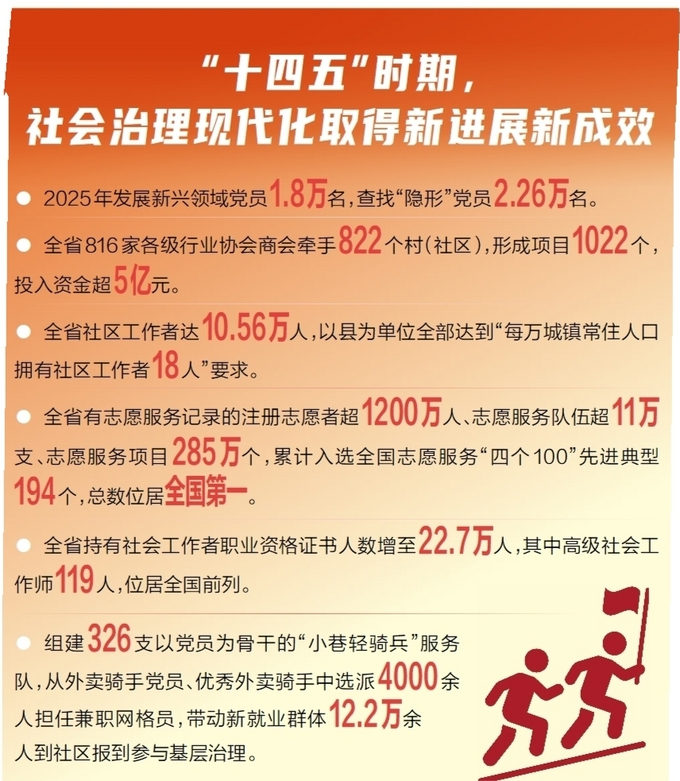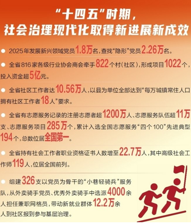 30件基层证明事项全部"云开具";新就业群体12.2万余人参与基层治理;建成209个全国民主法治 示范村(社区)……1月8日,省政府新闻办召开"高质量完成'十四五'规划"系列主题新闻发布活动第八 场——"提升现代化治理水平"主题新闻发布会,介绍我省五年来在治理水平现代化上取得的新进展、新 成效。 社会治理精准化精细化 "十四五"时期,我省锚定"高效能治理"目标,着力完善社会治理体系,社会工作体制机制更加健 全,党在新兴领域的号召力、影响力、凝聚力不断增强,党建引领基层治理和基层政权建设得到夯实, 凝聚服务群众工作质效持续提升。 基层治理是国家治理的基石。省委社会工作部部长、省委"两新"工委书记、省信访局局长胡建军介 绍,我省理清乡镇(街道)基本履职事项125项,配合履职事项74项,率先在16个县(市、区)试点编 制村(社区)工作事项清单,30件基层证明事项全部实现"云开具",98%以上的村(社区)实行"小微 权力"清晰化管理,广大基层干部把更多时间和精力投入到推动发展、服务群众上。 省委组织部副部长季振华说,为让基层干部"轻装上阵",我省研究制定《加强党建引领基层治理 为基层减负赋能重点任务清单》,明确为基层 ...