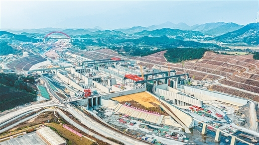 2月19日,建设中的平陆运河马道枢纽,世界级内河省水船闸主体结构已全面完工。(平陆运河集 团供图) "这是运河回填土里长出来的有机蔬菜。"平陆运河集团董事长王劼耘告诉记者,平陆运河土石方开 挖总量达3.15亿立方米,为实现回填土"变废为宝",集团打造抬填造地种植示范基地,筛选出27个适宜 种植的果蔬品种,为现代农业发展创造条件。 记者跟随唐策乾登上66.8米标高的省水池平台。往下俯瞰,建成的闸室高墙,仿佛由天坑向云端生 出的峭壁,气势逼人。坑底像小长凳一样整齐摆放的,是消能盖板。穿着红色马甲的工人,在坑道里穿 梭忙碌,像一个个跳动的红色音符。 "你看,闸口分流口上,树都已经种上了。"顺着唐策乾手指的方向望去,一排排树木已长出新绿。 不远处,一座240米长的拱门大桥凌空飞架,那是专为两岸野生动物迁徙而打造的动物通道。运河 通航后,将为斑林狸、豹猫、赤腹松鼠等野生动物,开辟一条安全便捷的迁徙廊道。 "带你们去看看我们的'地下森林',保证让人眼前一亮。"唐策乾笑着卖了个关子。随即,我们来到 省水池内部工作平台。踏入其中,但见上百根巨大的水泥柱密密匝匝,巍然挺立。正是这一片郁郁葱葱 的"地下森林",稳稳托举起上方庞大 ...