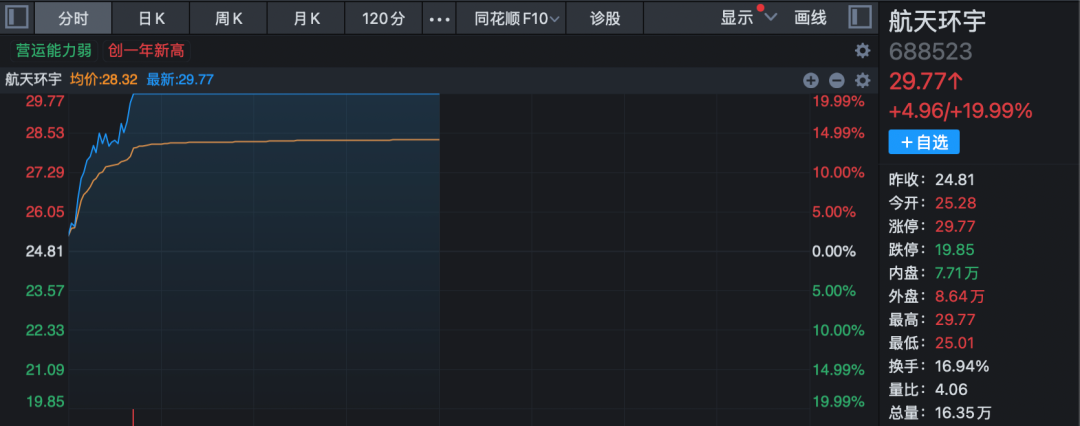 Wind数据统计显示,2025年前三季度国防军工全行业实现营收4507.88亿元,同比增长6.74%;净利润244.52亿元,同比微增0.02%。其中,航海装备子板 块营收同比增长16.2%,净利润激增87.5%,毛利率从11.2%上升到13.2%。 此外,低空经济板块也表现活跃。雷科防务开盘仅约8分钟直线涨停;特发信息同样快速涨停,连续第2日封板;飞沃科技、广汽集团等逾10股涨停或涨超 10%。 今日早盘,A股高开低走,小盘成长股略显强势,中证1000微幅飘红,上证指数、深证成指、创业板指、沪深300等则小幅飘绿。上涨个股远多于下跌个 股,成交呈进一步萎缩趋势。 盘面上,国防军工、房地产、酒店餐饮、风电设备等板块涨幅居前,林业、能源金属、消费电子、海南自贸等板块跌幅居前。 军工股全线上攻 国防军工股早间全线上攻,板块指数放量高开高走。航天环宇高开后快速20%涨停,股价创2年来新高(复权,下同),开盘不到10分钟成交超前一交易 日全天成交;久之洋、雷科防务、天箭科技等涨停或涨超10%。 | 分时 | 日 K | 周K | 月K | 120分 | ... | 同花顺F10v | 诊股 | 显示 √ 画线 | | ...