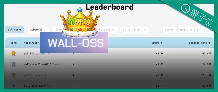 嘻疯 发自 凹非寺 量子位 | 公众号 QbitAI 国产具身智能基座模型,再次突破! RoboChallenge真机评测榜单上,来自 自变 量机器人的 端到端具身智能基础模型WALL-OSS ,以46.43分的成绩,超越美国具身智能明星 公司Physical Intelligence的pi0 (π0) , 总分 排名 全球第二 。 | | Beta | Home | Challenges | Runs | Leaderboard | News | Community | Eval Your Policy | Log In | | --- | --- | --- | --- | --- | --- | --- | --- | --- | --- | | | | | | Leaderboard | | | | | | | all tasks | table-30 > | Search by tag v | | Search by task v | | Is multitask > | | Search by model or user | Q | | Rank | Model/User | | Is multi ...
