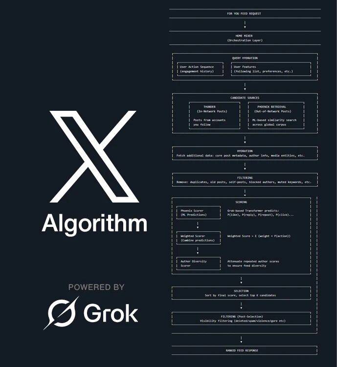 - HOME HIXER (Orchestration Layer) User Features (following list, pe THINDER (In-Network Posts) PHOENIX RETRIEVAL (Cut-of-Network Post Posts from accounts based sinilarity nel data: core post actadata, author Info, old posts, self-posts, blocked aut suited Verseneds Algorithm Phoenix Scorer (ML Predictions) Grox-based Transformer predicts: P(1ike), P(reply), P(repost), P(click) Welghted Scorer (Conbine predictions) Attenuste repeated auth to enture ford diversity powered by by final score, select top K cand ...