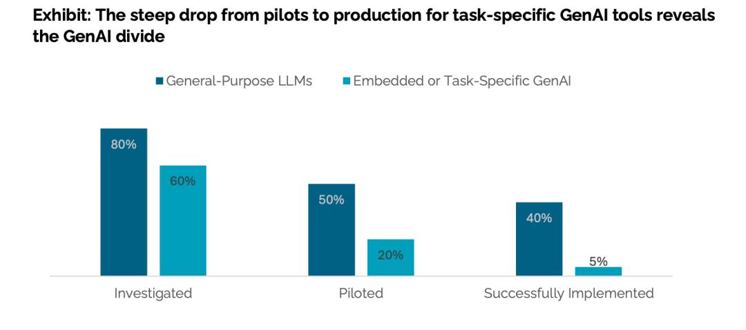 Core Viewpoint - A recent MIT report highlights a significant "Generative AI Gap," revealing that 95% of organizations have not achieved measurable returns on their $40 billion investment in generative AI over the past year, indicating a struggle to realize substantial business transformation despite high adoption rates [2][3]. Group 1: Investment and Returns - The report indicates a stark contrast between AI investment and its disruptive impact, with only the technology and media sectors showing structural changes, while seven other industries, including finance and healthcare, have not seen transformative business models or changes in customer behavior [3]. - Approximately 70% of AI budgets are allocated to front-office departments like sales and marketing, which yield easily quantifiable results, while high ROI applications in back-office functions often go underfunded due to their less direct impact on revenue [5]. Group 2: Implementation Challenges - The transition rate from AI pilot projects to actual production applications is alarmingly low, with only 5% of organizations successfully deploying tailored AI systems, despite 60% evaluating such tools [3][4]. - A significant "shadow AI economy" is emerging, where over 90% of employees use personal AI tools like ChatGPT for work tasks, often without IT's knowledge, highlighting a disconnect between official AI initiatives and individual productivity gains [4]. Group 3: Characteristics of Successful Organizations - Successful organizations that have crossed the generative AI gap tend to treat AI procurement as a partnership with service providers, focusing on deep customization and measurable business outcomes rather than abstract model benchmarks [5][6]. - Companies that decentralize AI implementation to frontline managers, who understand actual needs, have a success rate of 66% when deploying AI through strategic partnerships, compared to 33% for those relying solely on internal development [6]. Group 4: Future Outlook - The report emphasizes the urgency for companies to shift from static AI tools to customizable, learning systems, as the market's expectations for adaptive AI are rapidly evolving [6][7]. - Organizations are advised to stop investing in static tools and instead collaborate with vendors that offer tailored, learning-based systems, focusing on deep integration with core workflows to bridge the generative AI gap [7].