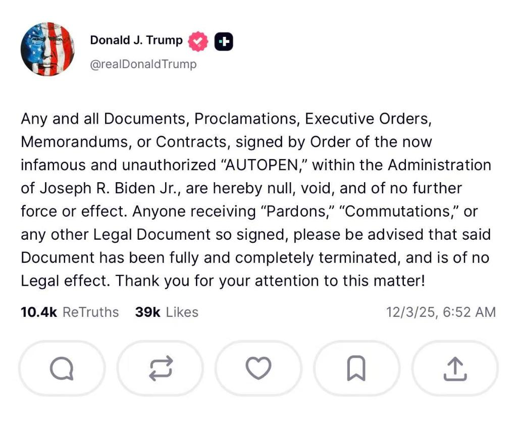 特朗普在"真实社交"上的发文截图。 自动签名笔是一种能精准复制个人签名的设备,通常用于签署大批量或仪式性的文件。据路透社报道,美国民主、共和两党的总统都曾使用该设 备签署信件和公告。特朗普及其支持者却坚持认为,拜登在任期间使用该设备签署的行政令无效,还暗示拜登对这些行政令并不完全知情。目前 尚不清楚拜登是否曾使用自动签名笔签署过赦免令。 美国总统特朗普2日说,他将终止前总统拜登用自动签名笔签署的所有文件的有效性,包括赦免令。 特朗普当天在社交平台"真实社交"上发文说:"任何收到以该方式签署的'赦免令''减刑令'或其他任何法律文件的人请注意,上述文件已被完全终 止,不具备任何法律效力。" 特朗普今年1月20日宣誓就职。拜登在卸任前最后一刻宣布,"预防性"赦免"国会山骚乱"众议院特别调查委员会成员等人,以防止特朗普上台后对 他们进行报复。获赦免人员还包括拜登的5名亲属。 3月17日,特朗普在社交媒体上发文称,因为上述赦免令由自动签名笔而非拜登本人签署,且拜登"对此一无所知",这些赦免令无效。特朗普在帖 文中并未给出上述判断的根据。 据美联社和美国《华盛顿邮报》先前报道,美国保守派智库传统基金会的"监督项目"人员3 ...