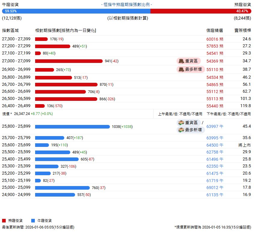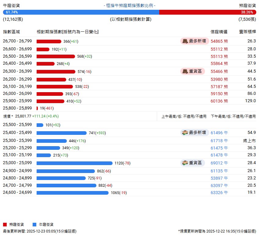 Group 1 - The latest bull-bear ratio for the Hang Seng Index is 62:38 as of December 5 [1] - The heavy area for bear certificates is in the range of 26,300 to 26,399, with the latest number of bear certificates at 723, an increase of 73 from the previous trading day [1] - The most significant increase in bear certificates occurred in the range of 26,000 to 26,099, with the latest count at 351, which is an increase of 175 from the previous trading day [1] Group 2 - The heavy area for bull certificates is in the range of 25,100 to 25,199, with the latest number of bull certificates at 1,516, a decrease of 5 from the previous trading day [1] - The most significant increase in bull certificates occurred in the range of 25,500 to 25,599, with the latest count at 866, an increase of 207 from the previous trading day [1]