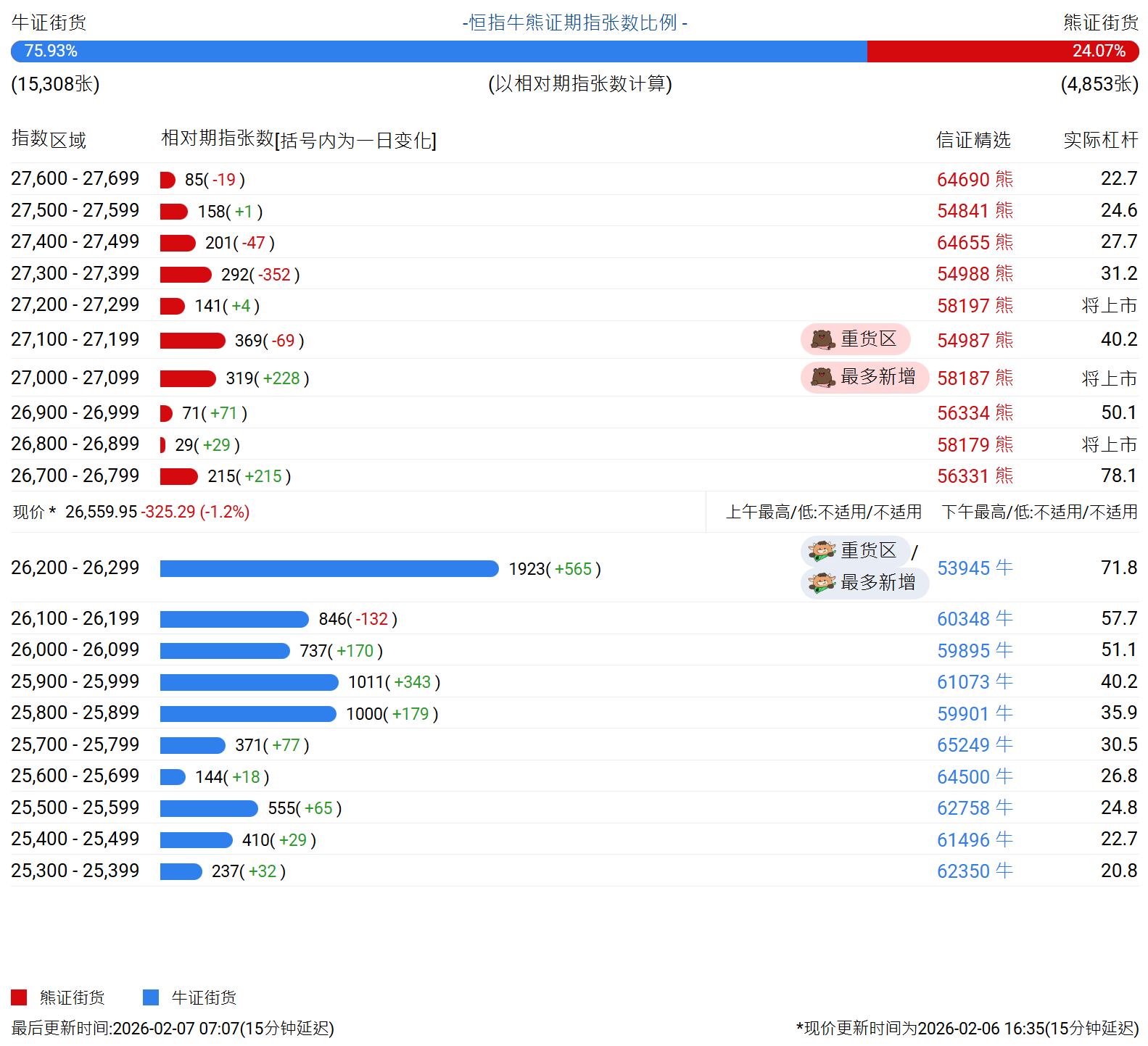 Core Viewpoint - The latest data indicates a bullish-bearish ratio of 76:24 for the Hang Seng Index, with significant movements in the distribution of bull and bear certificates [1][2]. Group 1: Bullish Certificates - The heaviest concentration of bull certificates is in the range of 26,200-26,299, with a total of 1,923 certificates, an increase of 565 from the previous trading day [1][2]. - The overall percentage of bull certificates relative to the total number of certificates is 75.93%, equating to 15,308 certificates [2]. Group 2: Bearish Certificates - The heaviest concentration of bear certificates is in the range of 27,100-27,199, totaling 369 certificates, which is a decrease of 69 from the previous trading day [1][2]. - The most significant increase in bear certificates occurred in the range of 27,000-27,099, where the total reached 319 certificates, an increase of 228 from the previous trading day [1][2]. Group 3: Market Performance - The current price of the Hang Seng Index is 26,559.95, reflecting a decrease of 325.29 points or 1.2% [2].