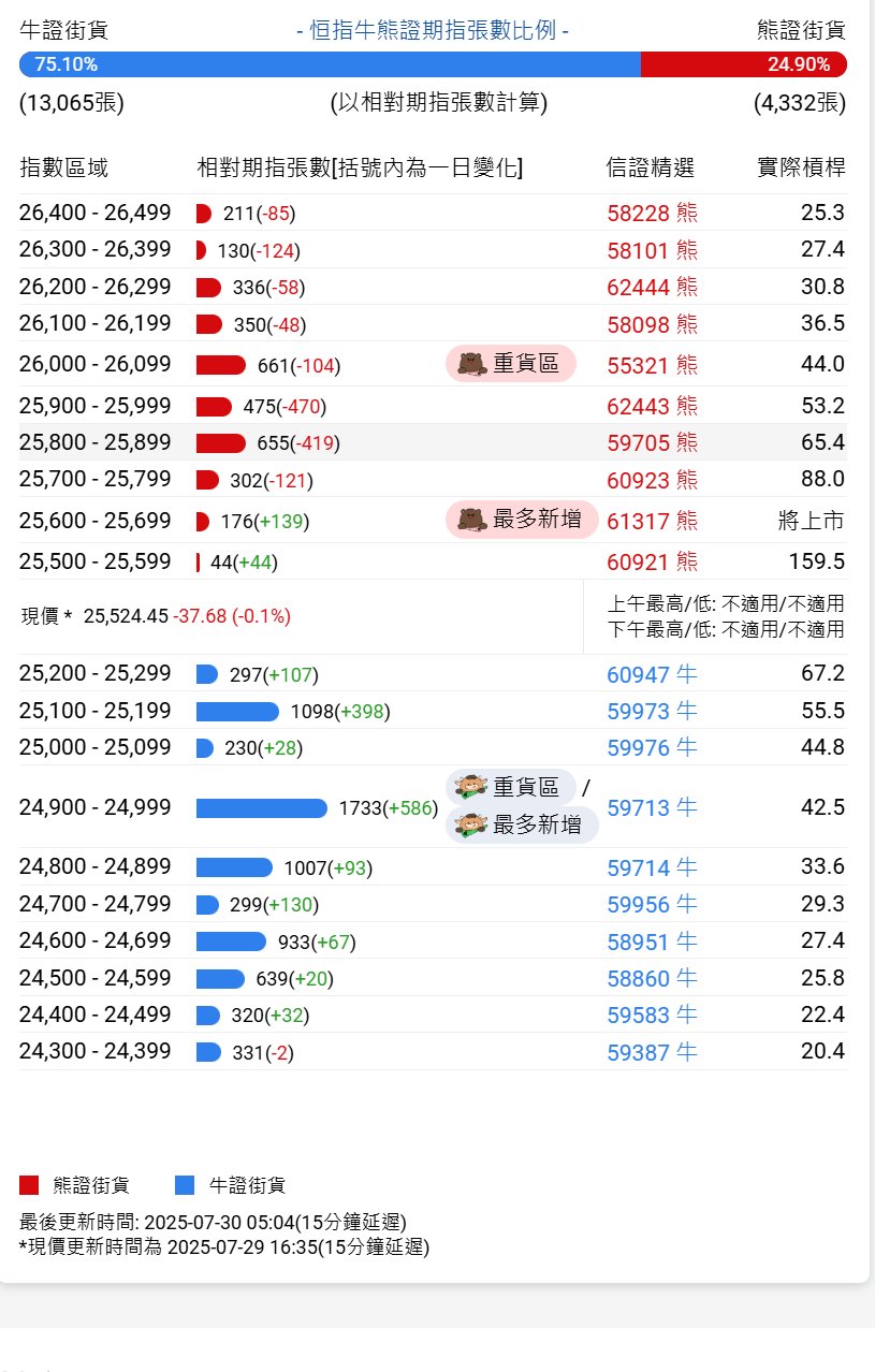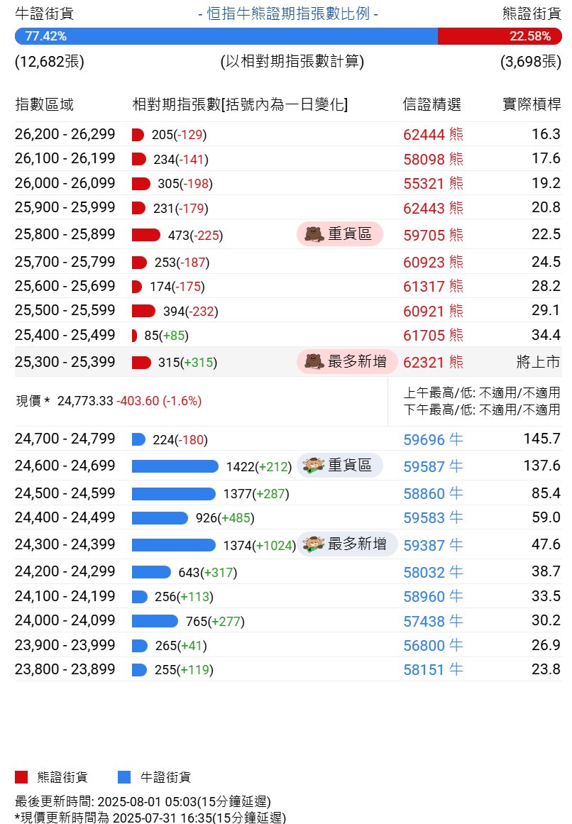 | 牛證街貨 | - 恒指牛熊證期指張數比例 - | | | 熊證街貨 | | --- | --- | --- | --- | --- | | 75.10% | | | | 24.90% | | (13,065張) | (以相對期指張數計算) | | | (4,332張) | | 指數區域 | 相對期指張數[括號內為一日變化] | | 信證精選 | 實際槓桿 | | 26,400 - 26,499 2 211(-85) | | | 58228 熊 | 25.3 | | 26,300 - 26,399 130(-124) | | | 58101 月 | 27.4 | | 26,200 - 26,299 - | 336(-58) | | 62444 点 | 30.8 | | 26,100 - 26,199 | 350(-48) | | 58098 BE | 36.5 | | 26,000 - 26,099 | 661(-104) | ■ 車賃區 | 55321 月 | 44.0 | | 25,900 - 25,999 | 475(-470) | | 62443 照 | 53.2 | | 25,800 - 25,8 ...