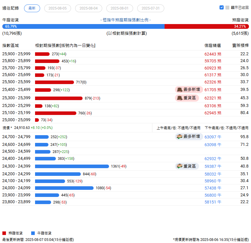 Group 1 - The latest bull-bear ratio for the Hang Seng Index is 66:34 as of August 7 [1] - The heavy area for bear certificates is in the range of 25,300 to 25,399, with 879 certificates, a decrease of 213 from the previous trading day [1] - The most significant increase in bear certificates occurred in the range of 25,400 to 25,499, with 298 certificates, an increase of 122 from the previous trading day [1] Group 2 - The heavy area for bull certificates is in the range of 24,300 to 24,399, with 1,361 certificates, a decrease of 49 from the previous trading day [1] - The most significant increase in bull certificates occurred in the range of 24,700 to 24,799, with 252 certificates, an increase of 252 from the previous trading day [1] - The overall distribution of bull and bear certificates indicates a shift in market sentiment, with a notable increase in bull certificates in lower ranges [2]