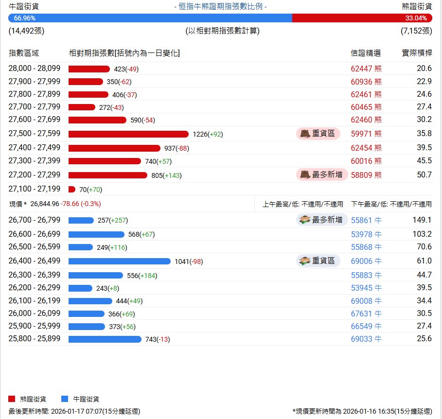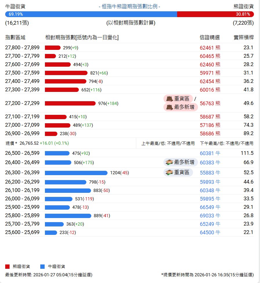 | 牛證街貨 | - 恒指牛熊證期指張數比例 - | | | 熊證街貨 | | --- | --- | --- | --- | --- | | 58.31% | | | | 41.69% | | (11,995張) | (以相對期指張數計算) | | | (8,575張) | | 指數區域 | 相對期指張數[括號內為一日變化] | | 信證精選 | 實際槓桿 | | 26,800 - 26,899 | 152(-1) | | 54534 BE | 24.6 | | 26,700 - 26,799 | 606(-7) | | 54865 NE | 26.9 | | 26,600 - 26,699 | 298(-8) | | 55112 NE | 28.7 | | 26,500 - 26,599 | 767(-15) | | 55113 RE | 33.1 | | 26,400 - 26,499 | 382(+3) | | 55864 RE | 38.6 | | 26,300 - 26,399 | 713(-3) | | 55466 RE | 45.4 | | 26,200 - 26,299 | 628(-20) ...