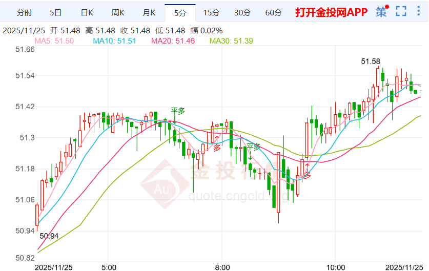 罗德里格斯强调,美国政府的具体目标是控制委内瑞拉的石油、天然气、黄金、钻石、铁和铝土矿。 此外,美国政府对委内瑞拉所支持的政治和意识形态概念"不安和担忧",这表明美国施压背后的动机不仅有经济因 素,也有意识形态因素,试图破坏委内瑞拉倡导的发展和主权模式。 今日周二(11月25日)亚盘时段,国际白银目前交投于41.42一线上方,今日开盘于51.37美元/盎司,截至发稿,国际白银 暂报51.47美元/盎司,上涨0.24%,最高触及51.58美元/盎司,最低下探50.97美元/盎司,目前来看,国际白银盘内短线 偏向看跌走势。 【要闻速递】 当地时间11月24日,美国政府正式将委内瑞拉所谓"太阳集团"列为"外国恐怖组织",对此,委内瑞拉副总统罗德里格斯 表示,美国在委海岸附近的军事部署旨在试图干预委内瑞拉以夺取其自然资源。 国际白银在趋势中走出上涨空间,目前最高在51.4,白银预计在48.5/52.5区间看待,坚持看到52.5附近,如果在本周破 位52.5,那么就可以形成单边走势,上方可见54前高,所以,这个周期白银是一个持单的过程。 突破52.46美元将暴露出10月中旬触及的54.46美元年度高点,随后是55.00 ...