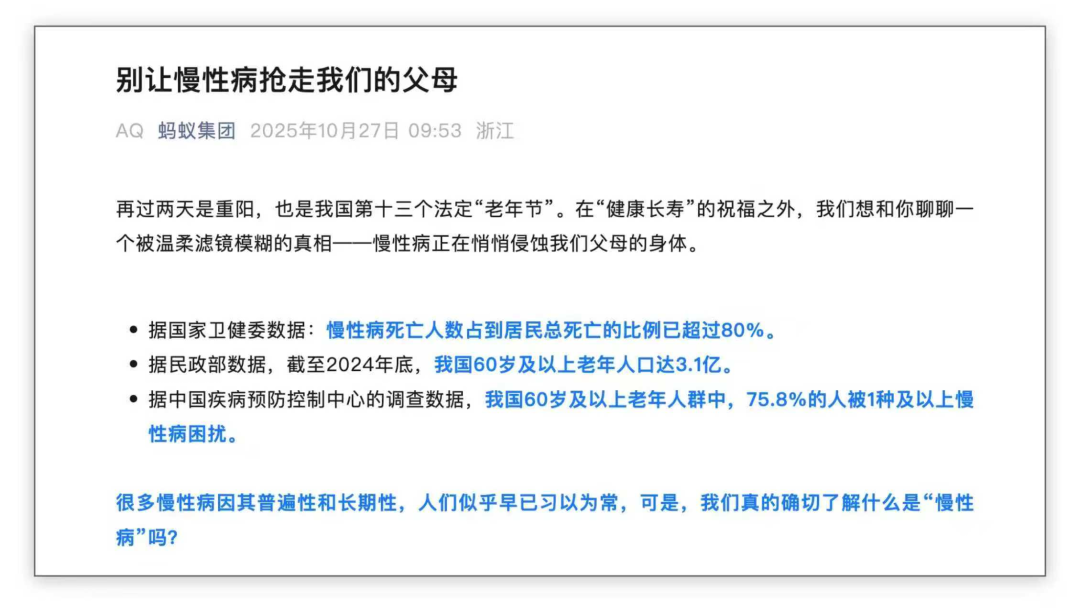 前不久重阳节,蚂蚁集团AI健康应用AQ发起倡议《别让慢性病抢走我们的父母》引发诸多讨论。在平台统计的后台数据中,糖尿病、高血压和抑郁症是 AQ上老年用户咨询量最高的三大慢性病。另一个真实处境是,目前我国有超六成老年人独居或仅与配偶同住,"空巢家庭"日渐成为常态,这让老年人健 康管理的困难持续加剧。 AQ的倡议引发了罗永浩、胡泳、六神磊磊、深圳卫健委等社会各界的响应,老年人慢性病管理问题引发关注。 不同于急性病,以心脏病、中风、糖尿病为代表的慢性病因其难以治愈、反复发作而困扰着许多老年人的生活。据中国疾病预防控制中心调查数据,截至 2025年,我国60岁及以上老年人群中,75.8%的人被一种及以上慢性病所困扰。对老年病人而言,慢性病其实不仅意味着日常生活的改变,还破坏了病人 的身体、自我和社会之间的联系。 当"治愈"不再是目的、"带病生存"成为了现实,病人究竟面临着怎样的困境?AI的出现有可能为慢性病人的家庭带来更多帮扶的可能吗? 以AQ为例,围绕老年慢性病健康管理,它推出了多项功能:拍一拍血压计、血糖仪即可智能解读数据;与鱼跃联合推出AI血压计,可自动同步数据并生 成健康周报,便于血压长期管控;推出慢性病用药 ...