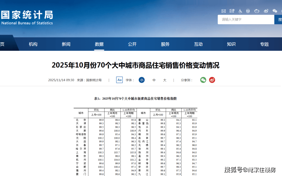 今天(11月14日)上午9时30分,相关部门(国家统计局)发布70个大中城市上个月(10月)房价最新数据! 70城10月房价数据出炉! 首先来看一看新房涨跌城市情况:除了沈阳、上海、杭州、合肥、乌鲁木齐以及韶关这6个城市新房房价环比(上个月)出现上涨,剩余 的64个城市全部下跌。 其中,上海以0.3%的环比涨幅领涨全国,成为一线城市中唯一实现正增长的城市,为当前低迷的房地产市场带来一丝暖意。 上海新房房价同比也是领涨全国,涨幅更是高达5.7%! 与此同时,还有6个城市同步出现上涨,分别是环比上涨的3个城市杭州(涨幅高达4%)、合肥、乌鲁木齐,以及南宁、成都和宜昌。 另外,沈阳和太原持平。 | 环比 | 同比 | 1-10月平均 | 1-10月平均 | 环比 | 同比 | 城市 | 城市 | 上年同月 | 上年同期 | 上年同期 | 上年同月 | 上月=100 | 上月=100 | | | | | | | | | --- | --- | --- | --- | --- | --- | --- | --- | --- | --- | --- | --- | --- | --- | --- | --- | --- ...