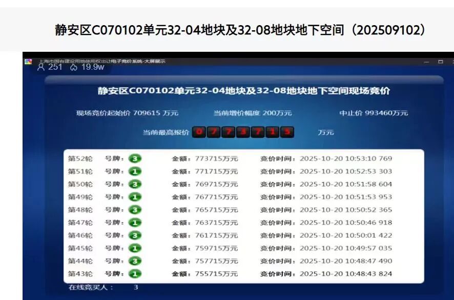 10月20日,上海2025年第八批次土地拍卖举行现场交易活动。市场关注较高的徐汇、静安两幅地块均溢价成交。其中,招商 蛇口联合体斩获静安区C070102单元32-04地块及32-08地块地下空间,而徐汇区WS5单元188N-I-21地块最终被中海收入囊中, 成交楼板价约148503元/平方米创出上海徐汇滨江板块成交楼板价的新纪录。 本次土拍共出让6幅地块,涉及松江区、徐汇区、宝山区、静安区、杨浦区等区域,总起始价约184.95亿元。 静安区C070102单元32-04地块及32-08地块地下空间的起始价在此次土拍6幅地块中最高,为70.9615亿元。该地块共吸引了3位 竞买人参与竞拍,竞争主要集中在1号竞买人与3号竞买人之间,且3号竞买人多次在1号竞买人报价后随即跟进抬高报价,展 现出对该地块志在必得之势。经过52轮竞价,最终3号竞买人——由招商蛇口、越秀地产、星狮、南通瑞宏置业组成的联合体 以77.3715亿元成功摘得该地块,溢价率约9.03%。 | 25 25 19.9w | | 静安区C070102单元32-04地块及32-08地块地下空间现场竞价 | | | --- | --- | --- | --- ...