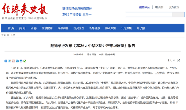 刚过去的2025年,房地产市场的分化行情让不少购房者看得眼花缭乱:二手房成了市场主力,核心城市 和远郊区县走势差得越来越远,一边是房价"跌穿底部"的焦虑,一边又有市场筑底的信号在显现。 如今站在2026年的起点,大家最关心的问题来了:楼市到底能不能迎来转机?是继续在底部徘徊,还是 会慢慢升温?刚需现在出手合适吗?改善家庭有没有资产升级的机会? 2026年是"十五五"的开局之年,也是房地产从深度调整走向平稳发展的关键一年。中央经济工作会议定 调"因城施策、控增量、去库存、优供给",这意味着市场将不再追求大规模的增量扩张,而是转向存量 盘活与品质提升。 告别普涨普跌:过去那种"买到就是赚到"的时代已经过去。2026年,楼市将呈现明显的分化特征。 核心城市、核心地段、高品质的"好房子"将走出独立行情,而远郊、老旧、缺乏竞争力的房产则可能继 续面临去化难、流通难的困境。 二手房成主力:随着存量时代的到来,二手房交易将持续活跃,成为市场成交的主力军。这也意味 着,新房市场将面临更激烈的竞争,倒逼开发商提升产品力。 对于2026年房地产市场的走势,多位专家也给出了乐观的预测。他们认为,在政策持续发力、市场信心 逐步恢复的 ...