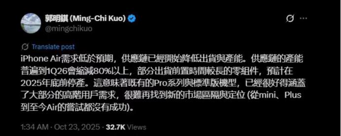 Core Insights - The iPhone Air is facing significant challenges in the market, with demand falling short of expectations, leading to a projected production capacity reduction of over 80% by Q1 2026 [1][5][6] - The iPhone 17 series has effectively met the majority of consumer needs, making it difficult for the iPhone Air to find a new market position [3][19] - Apple plans to cut production by 1 million units of the iPhone Air while increasing the iPhone 17 series production by 2 million units [5][6] Group 1 - The iPhone Air's starting price is 7999 yuan, but it is being sold at a lower price on second-hand platforms, indicating weak demand [6][12] - The iPhone Air only accounts for 3% of the overall sales of the iPhone 17 series, highlighting its poor market performance [7] - The iPhone Air has been criticized for its lack of competitive features compared to the iPhone 17 series, which offers better specifications at a lower price point [14][19] Group 2 - The iPhone Air's design sacrifices functionality for a thinner profile, which has not resonated with consumers [12][19] - The device's battery life is significantly lower than competitors, with only a 3149mAh battery compared to newer Android models [12][19] - The iPhone Air's reliance on eSIM technology complicates user experience, as the activation process is cumbersome in the current market [13][19] Group 3 - The iPhone Air's situation mirrors that of previous models like the iPhone mini and Plus series, which also struggled due to a lack of consumer demand [16][18] - Apple's focus on a single selling point has led to neglect of broader consumer needs, resulting in poor sales performance [19][20] - The extreme thinness of the iPhone Air aligns with future mobile design trends, but its value proposition remains questionable [19][20]