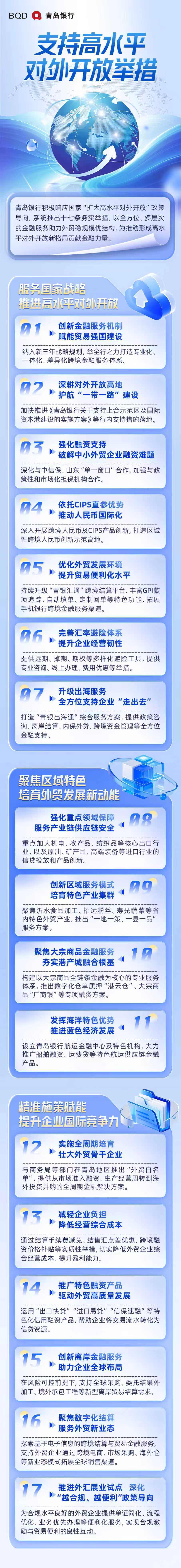 为深入贯彻国家关于"扩大高水平对外开放"的战略部署,青岛银行于近日发布《外贸金融白皮书》,系统性提出十七条具体举 措,全面助力外贸企业增强实力布局全球。 据悉,青岛银行已构建以青银汇通、青银贸贷、青银金桥、青银汇盈为核心的跨境金融产品体系,累计服务外贸企业超过5000 家,国际结算量突破200亿美元,跨境人民币结算量超过500亿元。随着CIPS直参系统正式上线,该行的跨境金融服务能力将进一 步提升。 在战略引领层面,青岛银行将金融支持稳外贸纳入战略规划,通过创新金融服务机制、积极参与自贸试验区金融试点、发挥CIPS 直参行优势、升级"青银出海通"综合服务等举措,持续提升贸易便利化水平、强化中小外贸企业的融资支持、推动人民币国际 化、全方位护航企业"走出去"。 在区域深耕层面,该行紧密结合山东外贸产业特色,聚焦机电、农产品、纺织品等优势领域,创新实施"一地一策、一县一品"服 务模式,构建涵盖"港云仓"数字化仓单质押等创新工具的大宗商品全链条金融体系,并积极发展蓝色金融,推出船舶融资、运费 贷等特色航运金融产品,助力培育具有国际竞争力的区域外贸产业集群。 在精准赋能层面,青岛银行围绕企业需求,推出全周期培育、减费 ...