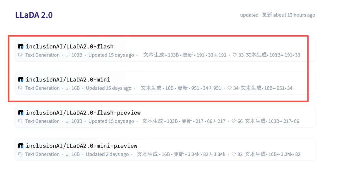 机器之心报道 编辑:杜伟、张倩 万万没想到,年初还是个小众方向的「扩散语言模型(dLLM)」,现在已经被扩展到千亿参数的规模了。 前段时间,我们在 HuggingFace 页面发现了两个新模型:LLaDA2.0-mini 和 LLaDA2.0-flash。它们 来自蚂蚁集团与人大、浙大、西湖大学组成的联合团队,都采用 了 MoE 架构。前者总参数量 为 16B,后者总参数量则高达 100B—— 在「扩散语言模型」这个领域,这是从未见过的规模。 更令人欣慰的是,模型变大了,也确实变强了:在涵盖知识、推理、编码、数学、智能体与对齐几大维度的 47 个基准测试中,LLaDA2.0-flash 平均得分 73.18, 与强 AR(自回归)模型 Qwen3-30B-A3B-Instruct-2507(73.60)持平 ,在编码(如 HumanEval、MBPP)、智能体(BFCL)等复杂任务上优势显著。 长期以来,自回归生成范式在大模型领域始终占据主导地位,这种从前到后依次生成下一个 token 的方法曾被寄予厚望。然而,其固有弊端也逐渐显现:长文本生 成的计算成本较高、推理速度较慢,且难以捕捉 token 之间的双向 ...