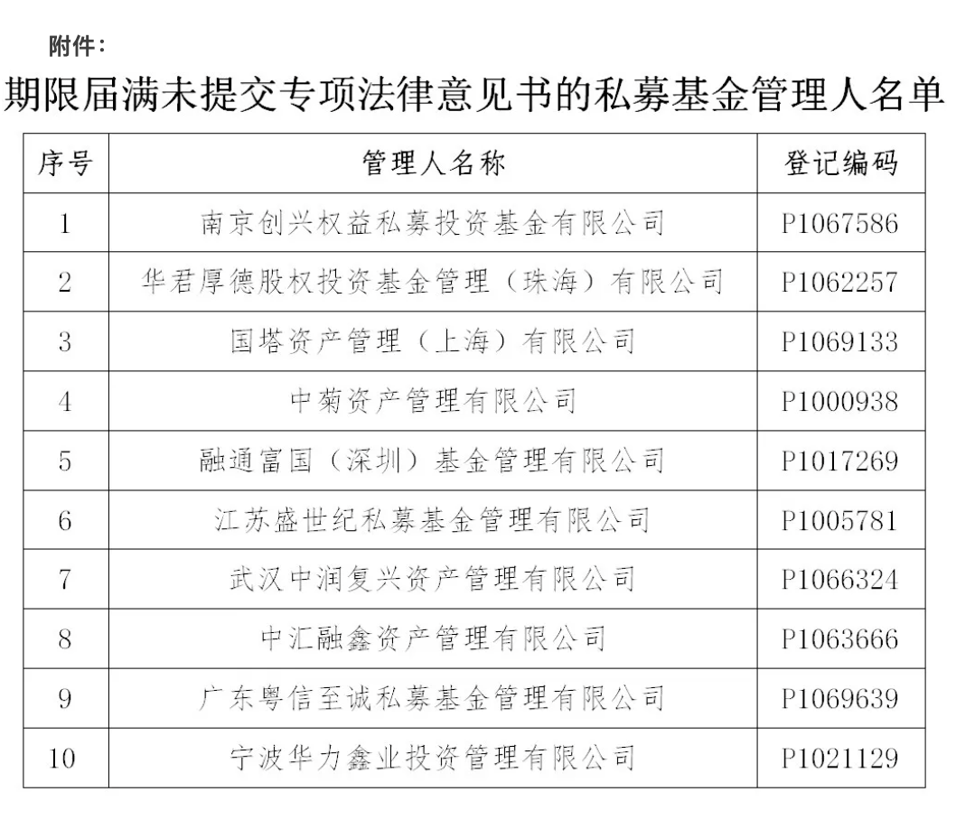 【导读】南京创兴权益等10家私募基金管理人被注销 10家私募基金管理人被注销 根据中基协公告,南京创兴权益私募投资基金有限公司等10家私募基金管理人存在异常经营情形,且未能在书面通知发出后的3个月内提交符合规定的专 项法律意见书,协会将注销该10家机构的私募基金管理人登记。 具体名单如下: 中基协出手,私募行业"扶优限劣"进行时。1月30日,中基协公告,注销10家"异常经营"的私募基金管理人。 在此次被注销的名单中,多家机构此前已因严重违规行为遭到地方证监局行政处罚,涉及挪用基金财产、承诺保本保收益、未实际履行投资管理职责等触 碰监管红线的行为。 | 序号 | 管理人名称 | 登记编码 | | --- | --- | --- | | 1 | 南京创兴权益私募投资基金有限公司 | P1067586 | | 2 | 华君厚德股权投资基金管理(珠海)有限公司 | P1062257 | | 3 | 国塔资产管理(上海)有限公司 | P1069133 | | 4 | 中菊资产管理有限公司 | P1000938 | | 5 | 融通富国(深圳)基金管理有限公司 | P1017269 | | 6 | 江苏盛世纪私募基金管理 ...